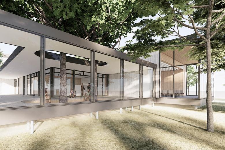 Das Gemeindezentrum soll als Gebäudeensemble in enger Beziehung zur Schlosskirche in den Park situiert werden. Hierbei wird besondere Rücksicht auf den vorhandenen Baumbestand genommen, um den qualitätvollen Charakter zu erhalten.