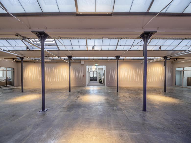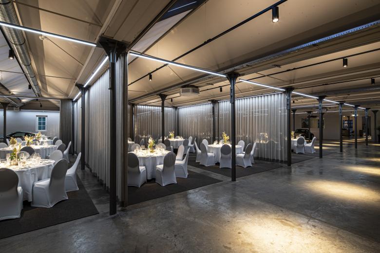 Die Eventlocation kann durch individuell ansteuerbare Beleuchtung in jeder Farbe in Szene gesetzt werden, um für jeden Anlass die passende Atmosphäre zu schaffen. Zusammen mit der indirekten Beleuchtung der Sheddächer und den Strahlern, die sich im Ausstellungswinkel frei einstellen lassen, ist eine flexible Beleuchtung der Alten Weberei garantiert.