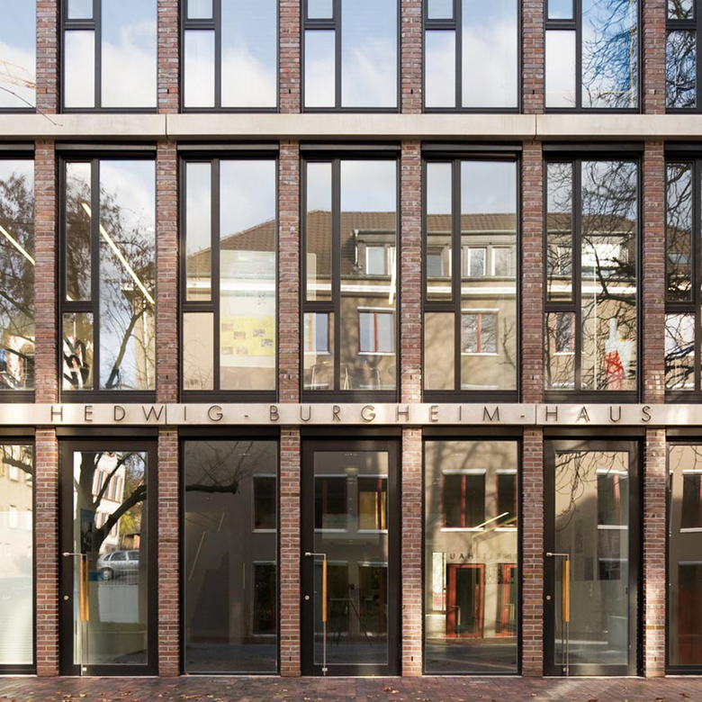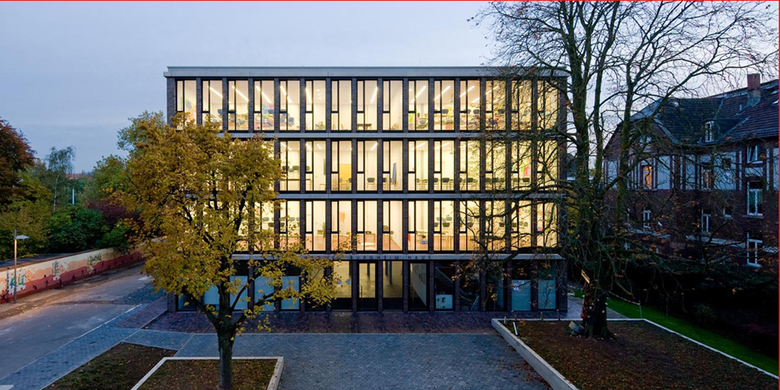 Der 4-geschossige Baukörper des neuen Schulgebäudes öffnet sich schaufensterartig zur Landgraf-Georg-Strasse. Zur angrenzenden Bebauung bildet sich ein campusartiger Platz. Die zentrale, alle Ebenen verbindende Innenhalle bildet das Herz der Schule. Mit ihren Galerien ist die Halle Treffpunkt für Schüler und Dozenten und Versammlungsstätte bei großen Veranstaltungen. Alle der Konzentration dienenden Räume sind ringförmig um die Halle angeordnet. Zwischen den Klassenräumen sind kleinere Gruppenräume angeordnet, so dass differenziertes Lernen in unterschiedlichsten Formen möglich ist. Das Fassadenmaterial nimmt Bezug zu den Altbauten des Elisabethenstifts und der Mathildenhöhe.