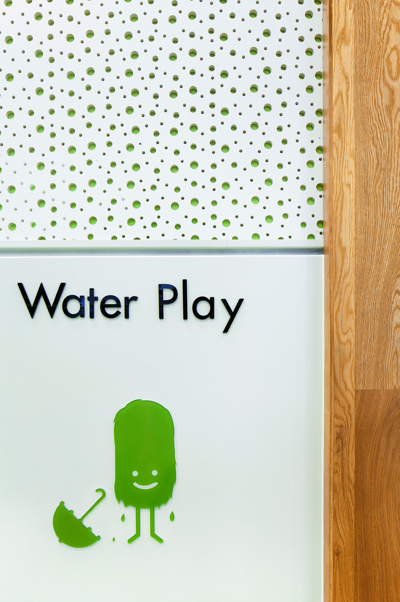 On the ground floor green is used in a reserved pace behind perforated panels and window reveals. From the entrance the dominant green staircase volume pulls you in, forming themain circulation path to the swimming pool upstairs.Following a clear sequence the parents and children are led from the welcoming lobby, passing by a water-play area, open play and cafe area through the stairwell.