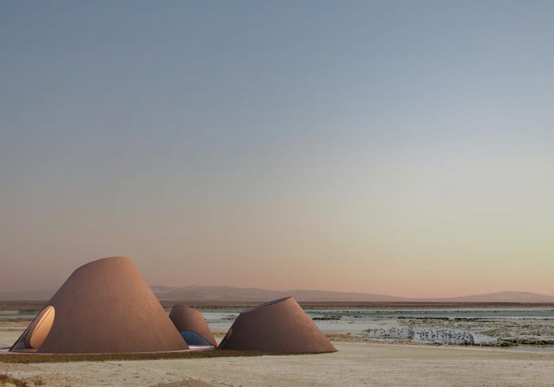 Each cone houses a distinct function—exhibition, administration, and visitor amenities—and is built using a 3D-printed mix of mud, rice husk, and straw. This low-energy material improves thermal performance, blends with the terrain, and reduces reliance on mechanical cooling. Strategic openings, skylights, and photochromic glazing enhance daylight and natural ventilation.