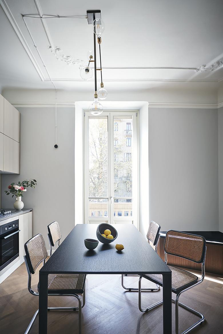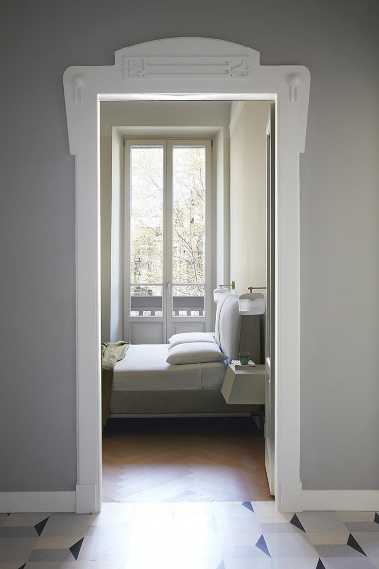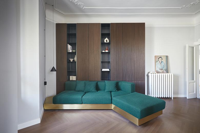 Our design was based on the desire to follow the diagonals and create spaces through a customised interior that look out onto both the Art Nouveau balcony and the heart of the house, the entrance foyer, which immediately became the connecting element between the different rooms and the point from which, thanks to the mirror panelling, you can catch a glimpse of each room.