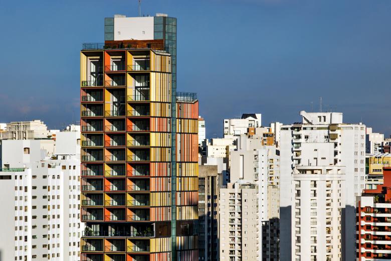 Edifici de 123 apartaments de petit format en una torre de 85m d'altura. El projecte s'enfoca a maximitzar les dues direccions principals de visió, al mateix temps que respon al requeriment de generar una terrassa equivalent en cada apartament i disposar de vestíbuls comuns i ascensors amb vista a la ciutat, en un solar de dimensions molt restrictives. La torre s'assenteixi sobre un sòcol d'aparcaments i espais comuns. Els espais socials es disposen en una planta intermèdia diferenciada que divideix la torre en dues parts.