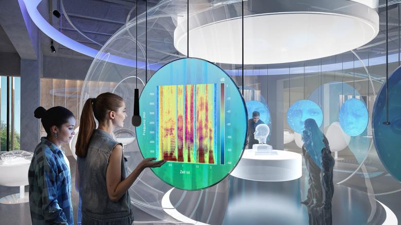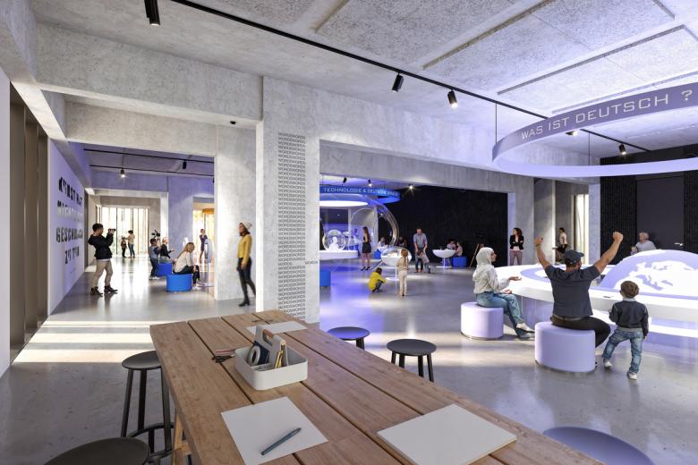 Der Rundgang durch die Ausstellung beginnt, nach einer Fahrt im Aufzug, im dritten Ober geschoss und schlängelt sich von dort hinab ins Erdgeschoss. In einer digitalen Präsentation – gestaltet von Atelier Brückner – erleben Besucher*innen in verschiedenen Sprachwelten die Vielfalt und kontinuierliche Entwicklung der deutschen Sprache in Kontakt mit anderen Sprachen, Sprachtechnologie und gesellschaft liche Debatten. In Form von gesprochenen oder geschriebenen „Sprachspenden“ können sie mit den Exponaten interagieren und sich damit selbst an der Sprachforschung beteiligen. Die Büros der Sprachforscher*innen sind direkt in die beiden unteren Ausstellungsebenen integriert. Eine Dachterrasse im Obergeschoss bietet einen Panorama-Ausblick über den Neckar und die Stadtsilhouette. Sie steht Mitarbeitenden wie Museumsgästen offen.