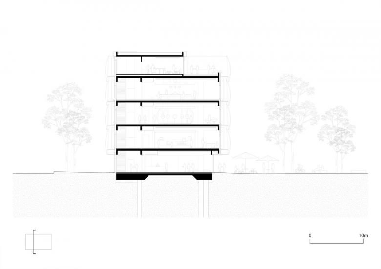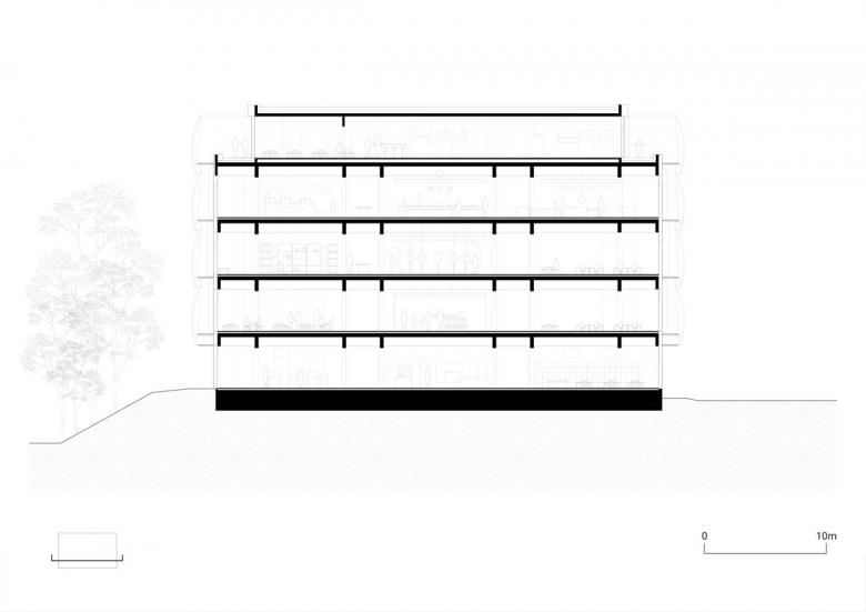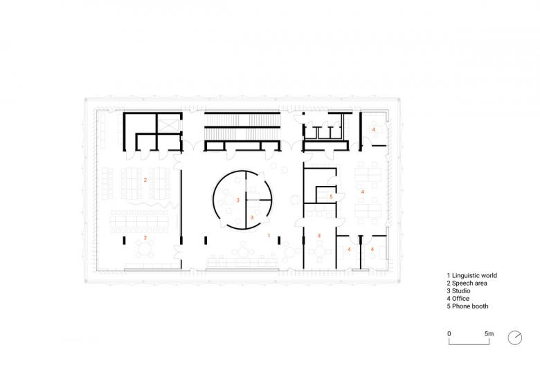 Die robuste Betonkonstruktion bleibt in allen Geschossen sichtbar und prägt dadurch den Charakter des Gebäudes. Unterzüge und Stützen teilen die Geschosse in kleinere Zonen auf, in denen die einzelnen Sprachwelten der Ausstel lung angeordnet sind. Als Reverenz an die Viel schichtigkeit von Sprache umhüllt den Neubau eine mehrschichtige Fassade. Die innenliegende Konstruktion, der Betonskelettbau, wird von einer alternierenden Fassade aus geschlossenen Holzrahmenbauelementen und einer Pfosten Riegel-Fassade umschlossen, welcher hölzerne, verstellbare Sonnenschutzlamellen vorgelagert sind. Diese Holzschicht wiederum wird durch eine Ebene aus eingespannten ETFE-Folien geschützt, die dem Gebäude seinen markanten Charakter verleihen.