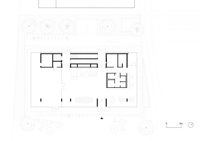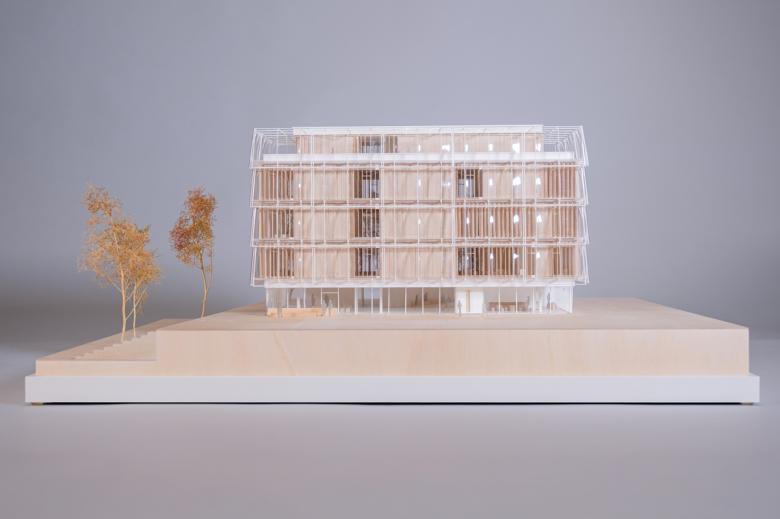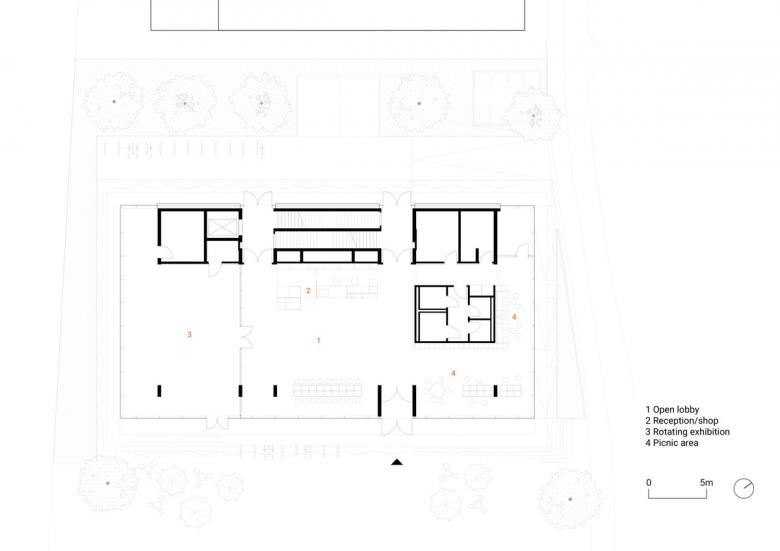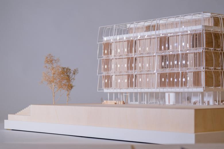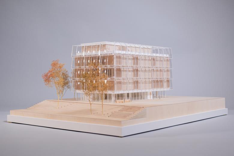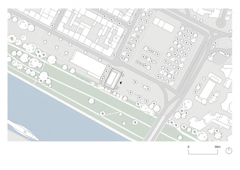 In der Neckarstadt im Norden Mannheims entsteht das Forum Deutsche Sprache am Alten Meßplatz. Der Neubau orientiert sich an den städtebaulichen Kanten des Platzes und erweitert diesen in Richtung Neckar, dessen Flussufer zeitgleich neugestaltet wird. Über dem fast vollständig verglasten Erdgeschoss kragen drei Obergeschosse über den Platz aus und laden so ins Gebäude ein. Es entsteht ein offenes Forum, ein fließender Raum zwischen Innen und Außen, Foyer und Platz, das zu einem Begegnungsort für alle Besucher*innen, Mitarbeitende und Menschen aus der Nachbarschaft wird. Mit Blick auf den Neckar bietet ein verglaster Raum hier Platz für Sonderausstellungen, Lesungen und Science Slams. Zum Alten Meßplatz hin ist ein frei zugänglicher Picknickbereich eingerichtet.