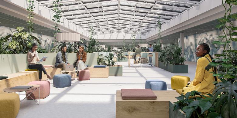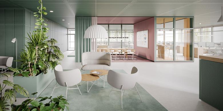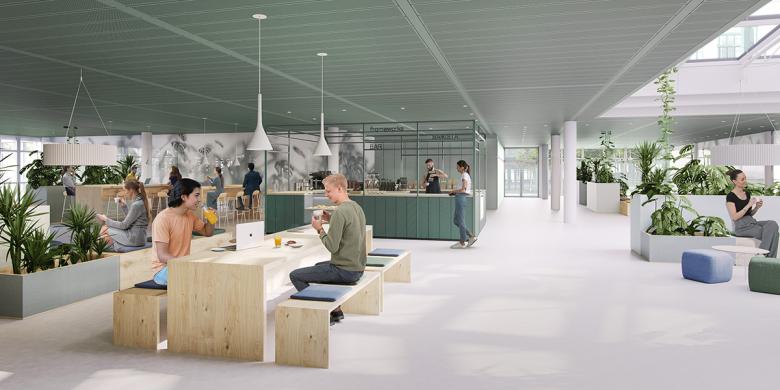 Anstatt die bestehenden Gebäude abzureißen, werden sie transformiert in Multi-Tenant-Gebäude, die Raum für Innovation und Individualität bieten und den Anforderungen an nachhaltige und gesunde Arbeitsumgebungen gerecht werden, indem sie vorhandene Materialien und Bauteile geschickt wiederverwenden. Die Umnutzung beinhaltet sowohl klassische Open-Space-Büroflächen als auch gemischte Bereiche mit leicht gewerblichem Charakter und Gemeinschaftsflächen. Das Raumkonzept erlaubt eine kontinuierliche Anpassung und Neuorganisation, um auf verändernde Anforderungen der Nutzer:innen zu reagieren. Mithilfe konfigurierbarer Module in jeder Mieteinheit ermöglichen wir maximale Flexibilität für vielfältige Nutzungen, von New-Work-Offices bis hin zu Innovation Labs für experimentelle Forschungsprojekte und Prototypenentwicklung. Individuell gestaltbare Workshop-Bereiche für konzentriertes Lernen und den interdisziplinären Austausch bieten Rückzugsmöglichkeiten. Das großzügige, attraktiv gestaltete Foyer unter dem verglasten Atrium fördert soziale Interaktion und unterstützt den kreativen Austausch in agilen Arbeitsstrukturen.