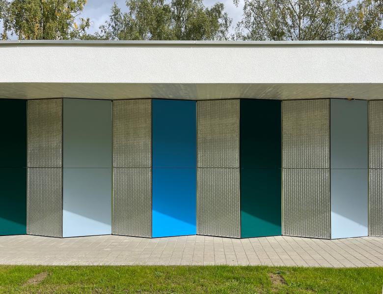 Die Aussenhülle der Raumkörper besteht aus einer filterartigen Schicht aus Faltladenelementen unterschiedlicher Ausführung und ist im Bereich des Streckmetalls lichtdurchlässig. Das Thema Welle wird so durch die Faltung aber auch durch die Farbgebung aufgenommen. Unterschiedliche Blau- und Grüntöne spiegeln das Thema Wasser.