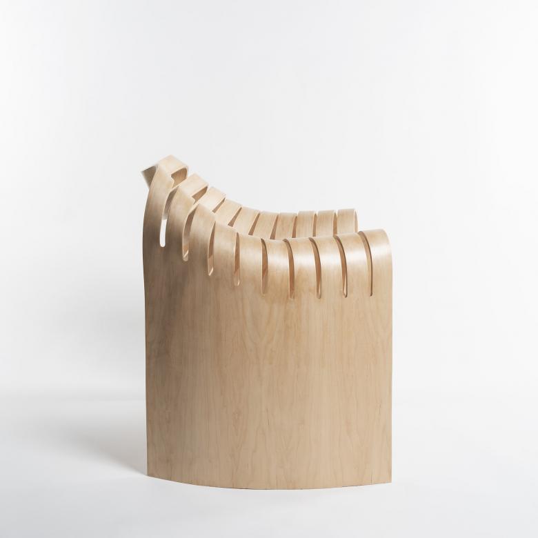 アイディアは非常に単純で、一枚の合板をストライプ状に切り欠き、曲率を丹念に調整しながら曲げてゆくだけです。