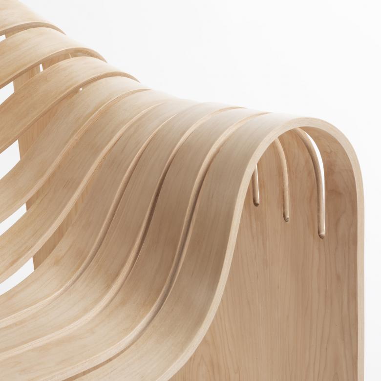 人が座っていないときは、合板でできた彫刻のようであり、人が座っているときは、座るために合板が自然にたわんだようにも見える、この椅子はそんな佇まいを漂わせています。