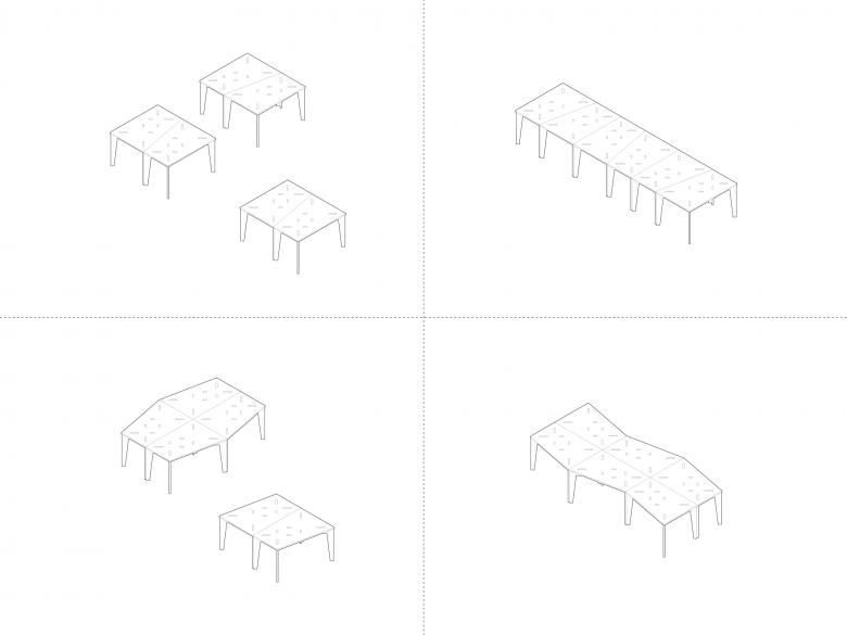 Sa forme, inspirée de la façade du bâtiment, a un impact direct sur sa modularité. En effet, l’asymétrie du plateau permet un nombre de combinaisons et de formes très variées, répondant ainsi au besoin d’adaptabilité de la situation. Tour à tour la pièce se transforme en salle de réunion, salle de jeux, en espace de travail partagé, en bar et ainsi de suite.