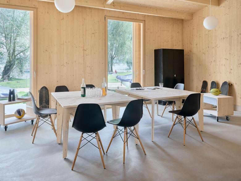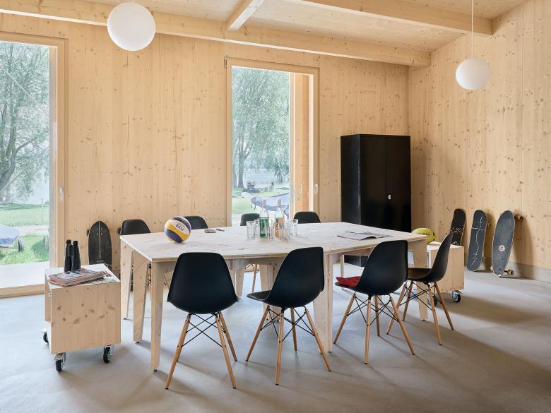 Pensé comme une continuité du centre nautique à une échelle réduite, son mobilier a été conceptualisé selon les mêmes critères que ce dernier, à savoir avec un accent indéniable mis sur la modularité, la simplicité et la rapidité d’exécution.
