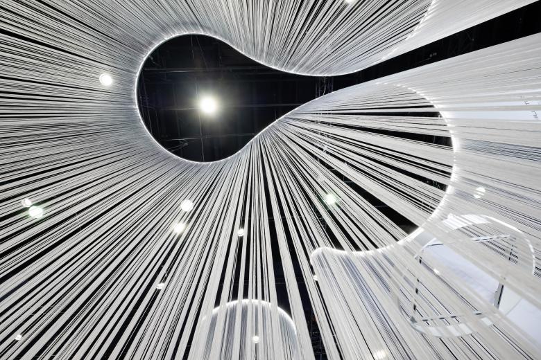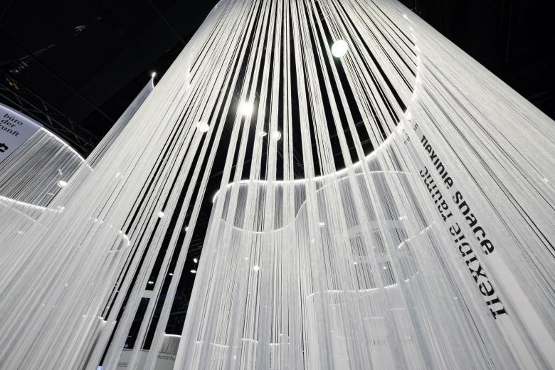 In contrast to the cool white lighting for the sculptural curtains, all circulation areas are illuminated with warm white light. Visitors, speakers, exhibitors and their products were illuminated by spotlights with warm white lighting. Track lighting at the break-out booths provide exhibitors with the adjustability they need.