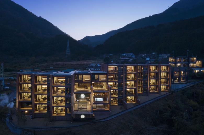 1900年に大分・別府で創業した関屋リゾートを事業主として誕生したホテル。扇状地のエッジを成す断層崖の上に立ち、湯けむりの街並みと別府湾が見晴らせ、35室の各室で掛け流しの温泉と景観が楽しめる。温泉と宿泊機能を中心としながらも、パブリックスペースが開放された「サイトスペシフィック(土地に根差した)」な建築空間と、12組のアーティストによるアートワークが触媒となる、地域の新たな交流拠点として計画された。
