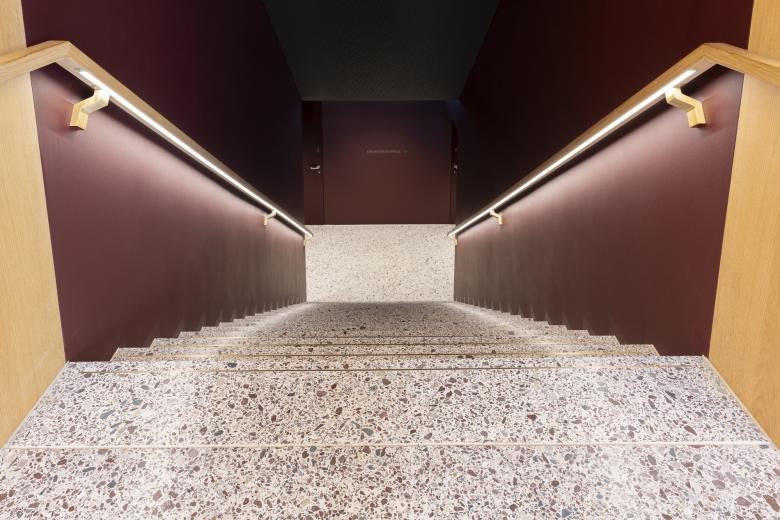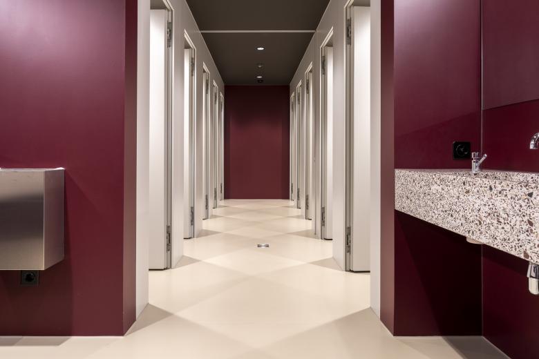In den einzelnen Nasszellen überzeugt neben den Brünneli auch unser PUROLISS® Boden- und Wandbelag. Die spezielle Verrucano Farbe, dunkles Weinrot, verleiht dem besonderen Baustil seine elegante Note. Der Kontrast zum Terrazzobelag passt hervorragend.