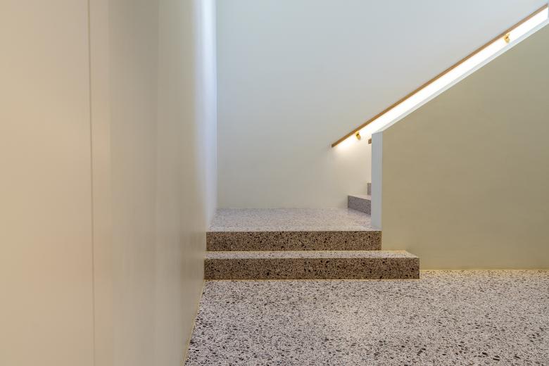Der Eingangsbereich, die Treppen so wie die Toilettentröge (Brünneli) sind mit unserem SURFATEX® Terrazzobelag aus Verrucanogestein gestaltet. Klingt erstmals nicht besonders speziell doch die zum Teil schieferartigen Gesteinsinhalte liessen sich schlecht scharfkantig schleifen, bis wir eine geeignete heimische Charge (Abbauort) gefunden haben.
