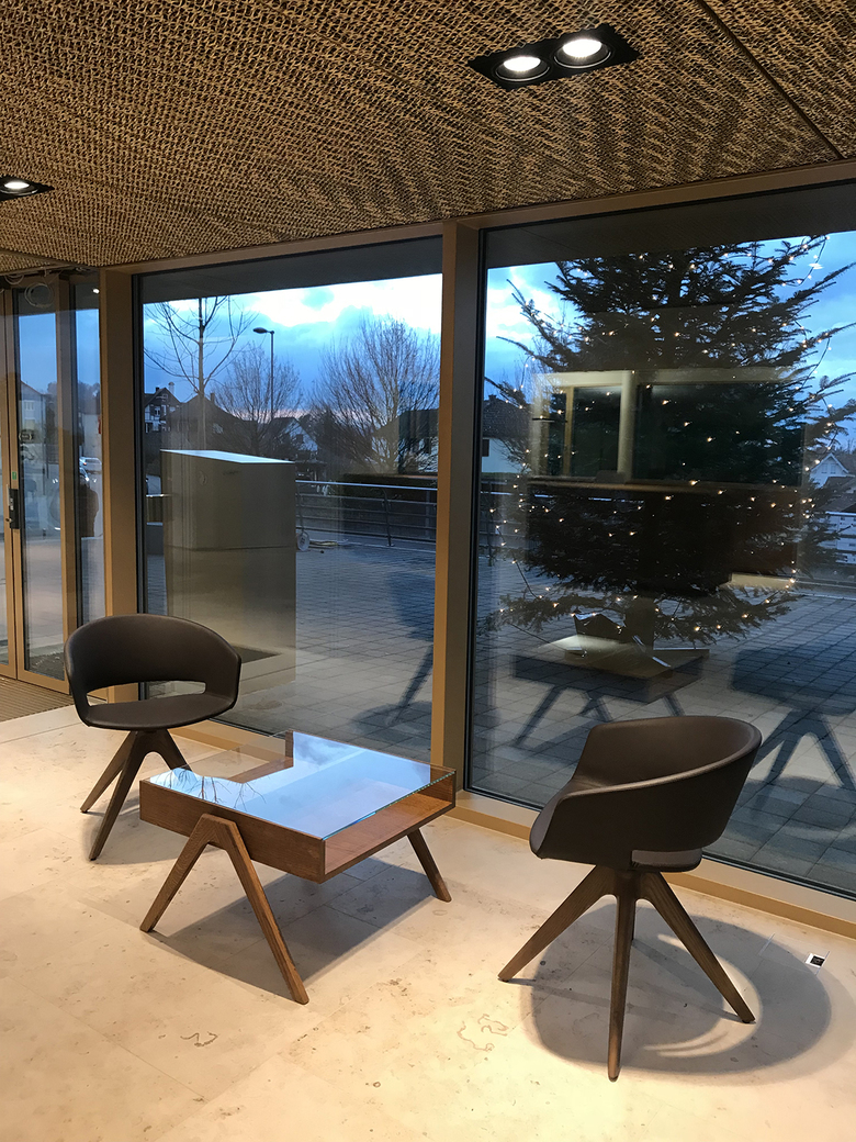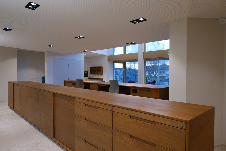 Das heutige Raumgefüge wurde in einen grosszügigen, kontinuierlichen Raum transformiert, welcher die gesamte Gebäudetiefe einnimmt. Unterschiedliche Höhen zonieren den Raum. Das hohe und luftige Foyer wird dabei von niedrigeren, intimeren Zonen für das Warten und für den Bereich an der Theke flankiert. Die grosszügigen Blickbezüge zum Vorplatz und zu der südseitigen Obstwiese schaffen einen Bezug zum Ort und eine Identität zur Gemeinde Rorschacherberg. Neue Materialien wie Rorschacher Sandstein für die Böden, einheimische Hölzer für Theke und Türen sowie goldfarbene Elemente für Verglasung und Deckenelemente sorgen zusammen mit der Raumgeometrie für eine zeitgemässe Erscheinung und eine angenehme Raumstimmung. Auch die Akustik profitiert von dieser neuen Form, was für das einwandfreie Funktionieren des Front-Office entscheidend ist. Von Aussen ist die neue, attraktive Anlaufstelle der Gemeindeverwaltung deutlich erkennbar. Die neue Verglasung wirkt einladend, offen und transparent. Genau so, wie man sich heute einezeitgemässe Gemeindeverwaltung vorstellt.