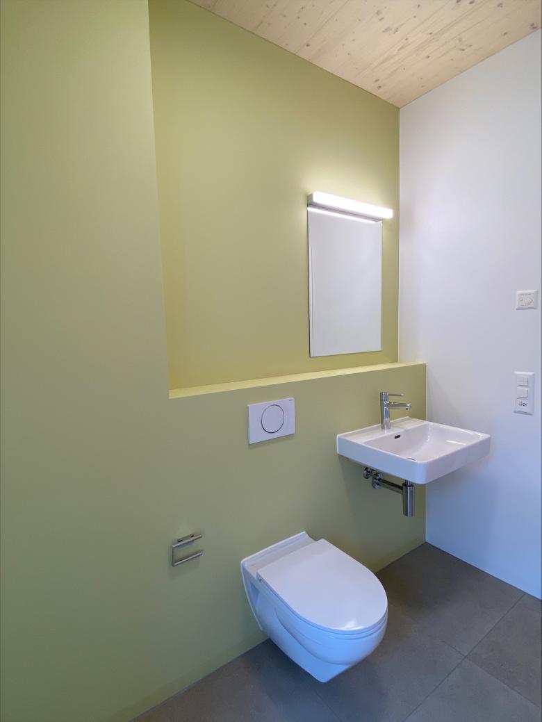 Der neue Gebäudeteil ist ein- bis zweigeschossig als Holzbau konzipiert auf eine muralen Garage deren Einfahrt ebenerdig zur Strasse ist. Er ist unterhalb bzw. im zweigeschossigen Gebäudeteil neben dem bestehenden Gebäude angeordnet. Das neue Dach ist als grosszügiges Gründach für das bestehende Gebäude nutzbar. Durch den Abriss der vorangebauten Gebäude und die niedrige Bauhöhe des neu zu erstellenden Anbaus wird eine Öffnung des bestehenden Wohngebäudes zum See ermöglicht. Ein Lift im Anbau ermöglicht die rollstuhlgerechte Erschliessung aller Gebäudeteile von der Garage aus. Fussläufig gelangt man über eine Treppe ins Atrium, von wo aus man entweder über den Hof in die Praxis gelangt oder eine weitere Treppe zum Wohnhaus. Privat und öffentlich zugänglich werden hier getrennt.