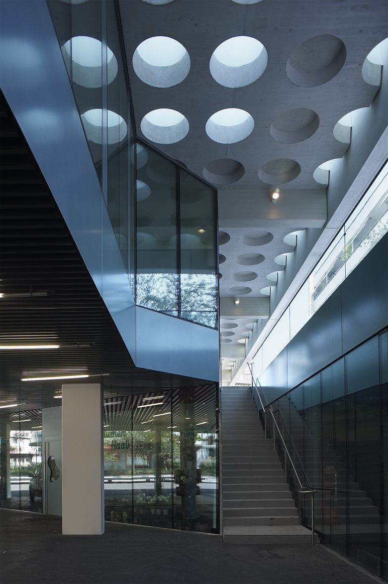 Ein neuer, horizontaler Baukörper stellt die Kontinuität entlang der Badenerstrasse wieder her. Durch die Aufstockung wird eine kompositorische Einheit mit der existierenden Anlage erreicht. Die Position der bestehenden Stützen wird übernommen und mit den massiven Unterzügen im Obergeschoss formbildend eingesetzt. Die vorgehängten Fassadenplatten in Sichtbeton, konzipiert als feines Vertikalrelief mit unterschiedlich tiefen Rillen, sind eine Reminiszenz an die ursprüngliche Fassadenverkleidung. Als Kontrast zur rigiden Struktur spannt sich eine filigrane Glashaut unter dem verbindenden Dach.