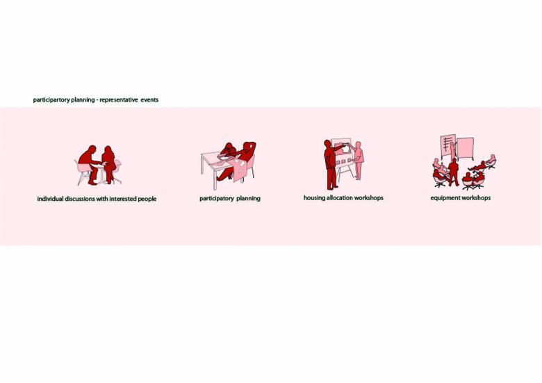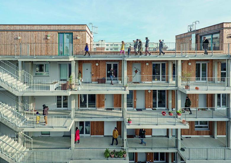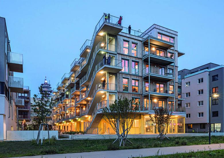 Lived Urbanity. We bring the village to the city. Under the motto “Setting the course together”, the co-housing project Gleis 21 was planned in a participatory manner with the future residents, from urban development to the socket outlet. The property is located in the center of the new urban development area "Leben am Helmut Zilk Park" near the Vienna Central Station („Hauptbahnhof Wien“). The project and the cultural association of the same name want to contribute to the development of the district. Communication within and outward, is key at Gleis 21. The co-housing project Gleis 21 builds on three major principles: “living in solidarity”, “indulging cleverly”, and “creating with media”. Solidarity is lived in a variety of ways, be it simple neighborhood services or a Solidarityfund for personal emergencies. Lived solidarity also includes certain appartements, that were planned in cooperation with Diakonie Flüchtlingsdienst (a refugee aid organization), that can be given to refugees. To help shape the cultural, social and media life in the newly developed quarter, a cooperation with Radio Orange, Okto TV and Stadkino Wien (cinema) was formed. The cultural Organization Gleis 21 is going to ensure a steady cultural program adapted to and in unison with its surroundings. A music-school on the lower floor rounds out the cultural scope of opportunity. Extensive communal areas represent the focus of the communal aspect and offer space for common and individual use: from the communal kitchen to the library and sauna on the top floor to the workshop, studio and fitness room in the basement. The selection and details of community-spaces were made by the residents and form the center of communal aspects of the project. The project was designed as a compact, zero-energy house („Niedrigstenergiehaus“) in a wood-hybrid construction and was built in a resources saving way. The individually planned housing-units on the upper four floors are accessed via an open north-west-facing arcade and are all equipped with private balconies. The neutral and flexible structure of the building enabled each unit to be planned individually in collaboration with its residents