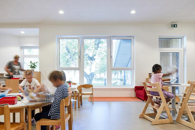 Bei unserem Entwurf für die Erweiterung des Kindergartens setzen wir auf eine Symbiose von Alt und Neu: das Bestandsgebäude blieb erhalten und wurde um einen Zubau erweitert. Ein großer Durchbruch in jedem Stockwerk verbindet die beiden Bauteile. Die effiziente Holzbauweise ermöglichte einen Umbau im laufenden Betrieb.
