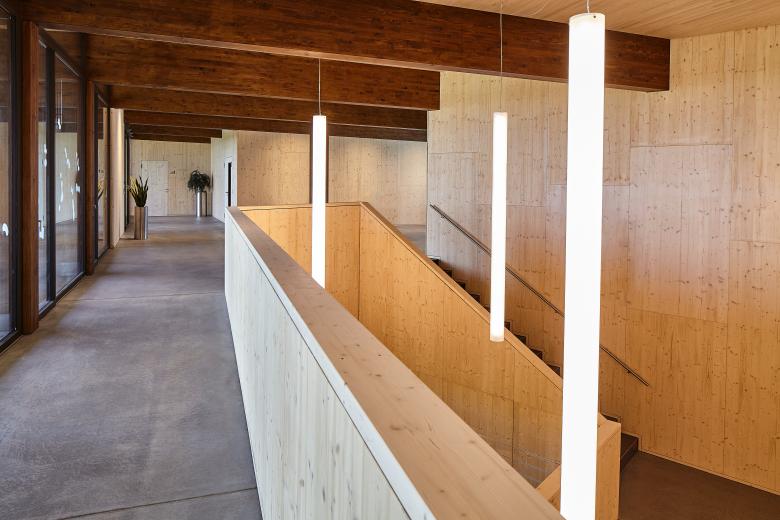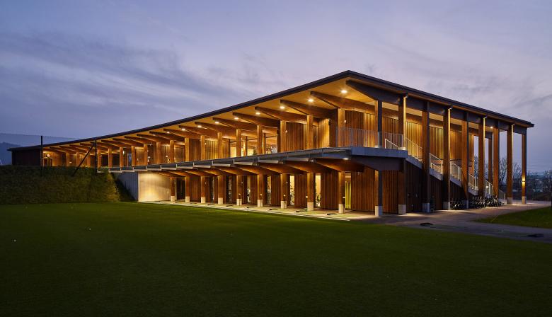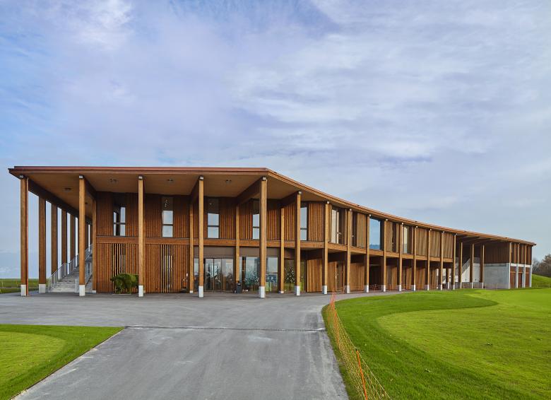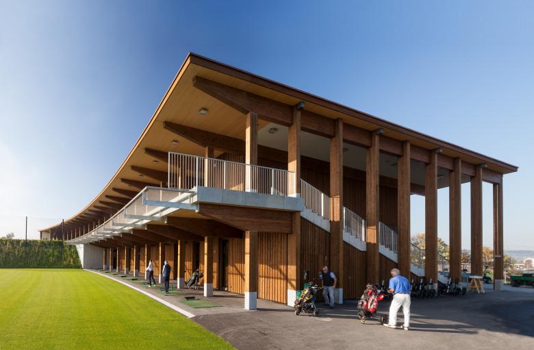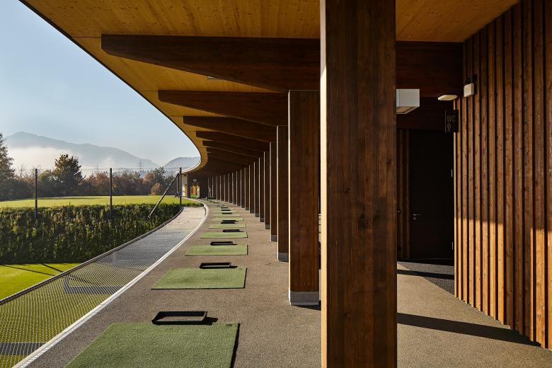 Bei der Ankunft auf dem Golfplatz wird der Besucher durch den einladenden zweigeschossigen Baukörper mit mehrschichtiger Fassadenstruktur und raumbildenden Arkaden empfangen. In den grosszügigen und gut ersichtlichen Eingangszonen kann er sich über das Angebot orientieren und findet die notwendige Infrastruktur wie Garderoben, Unterrichts-, und Trainingsräumlichkeiten in einem Gebäude vereint. Die Administration und Verwaltung des Golfparks erhält hier gut belichtete Arbeits- und Besprechungsräumlichkeiten. Die Caddiehalle und die Parkierung der E-Cars wird durch einen dezent in Erscheinung tretenden, zurückversetzten Gebäudekörper aufgenommen.