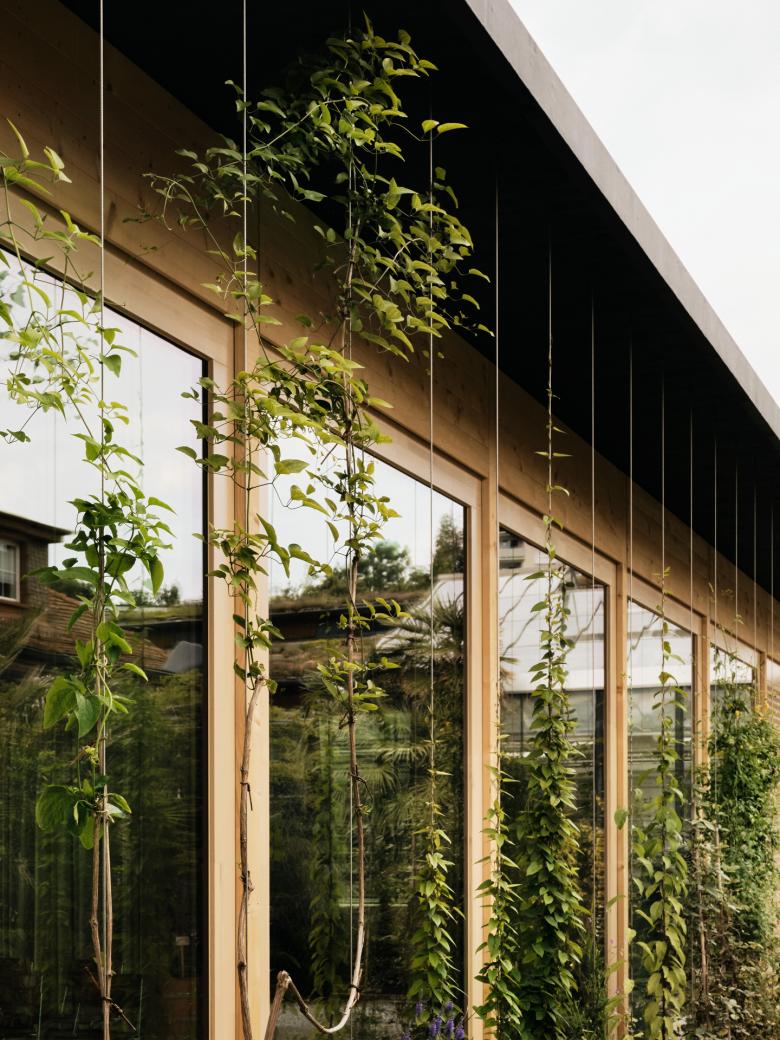 Winden- und Rankenpflanzen an Drahtseilen hüllen den Pavillon in ein lebendiges Pflanzenkleid. Eine Konstruktion aus regionalem Fichtenholz bildet das Gerüst des “Grünen Pavillons”.