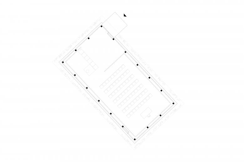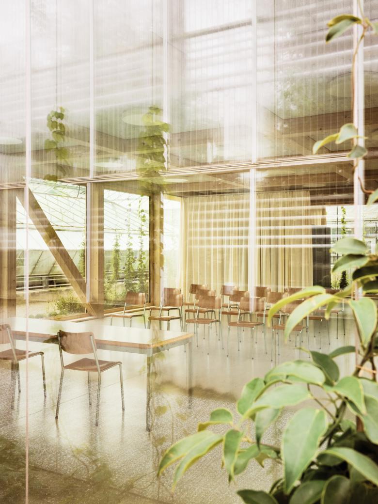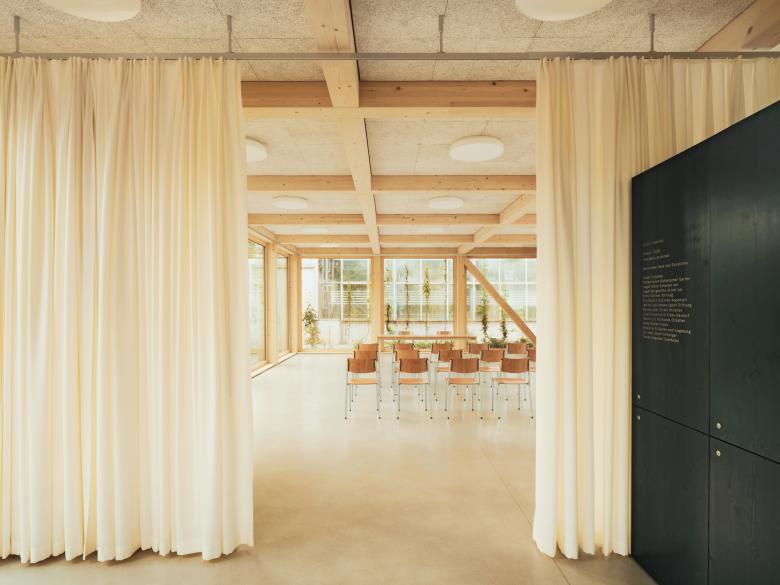 Der Boden besteht aus einer versiegelten und geschliffenen Betonplatte, welche die Sonnenwärme speichert und in der Nacht langsam abgibt. Die über die Diagonale an der West- und Ostfassade angeordneten, raumhohen Lüftungsflügel sorgen für Durchlüftung und Kühlung. Die Deckenleuchter sind eine Spezialanfertigung aus der Ostschweiz. Der Kubus aus Wandschränken zoniert den offenen Raum in Eingangs-, Haupt- und Abstellraum. Vorhänge variieren die Durchlässigkeit der Fassade und organisieren die multifunktionalen Nutzungen als Schulungsraum, Vortragssaal, Eventlocation, Arbeitsplatz und Lager.