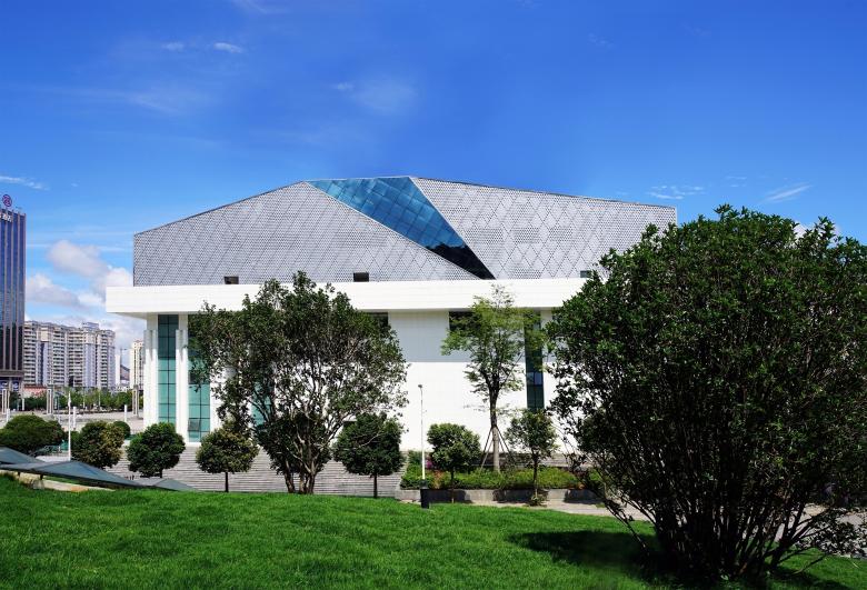 The folding roof originates from the unique peak cluster landform of South-west district in Guizhou. The roofs are converted into colorful glass crystals and perforated plates. The flexible folding roofs sparkling under the sun and fading in the rain to allude to the looming mountains.