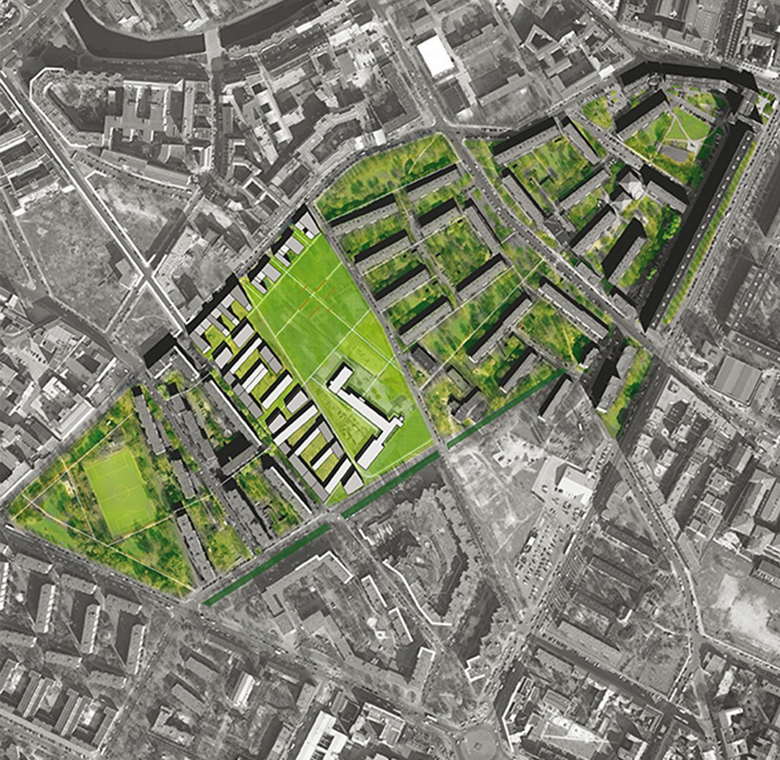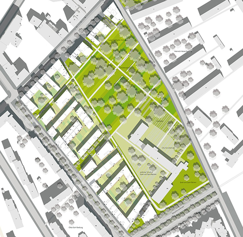 Die Struktur der Bebauung folgt den weitgehend beibehaltenen historischen Parzellengrenzen. Der homogene Blockrand mit innerstädtischen Adressen fasst Wohnhöfe, die mit bewährten Bautypen eine übersichtliche Nachbarschaft erzeugen. Zum Park kontrastiert Durchlässigkeit den Blockrand und macht diesen zu einem selbstbewussten Bindeglied im Stadtraum.