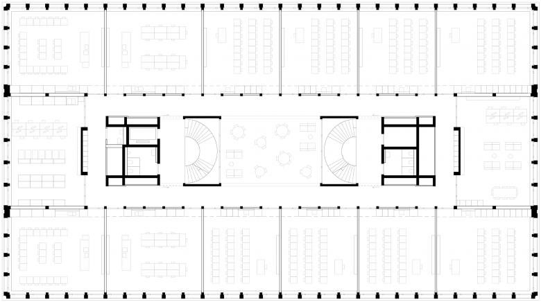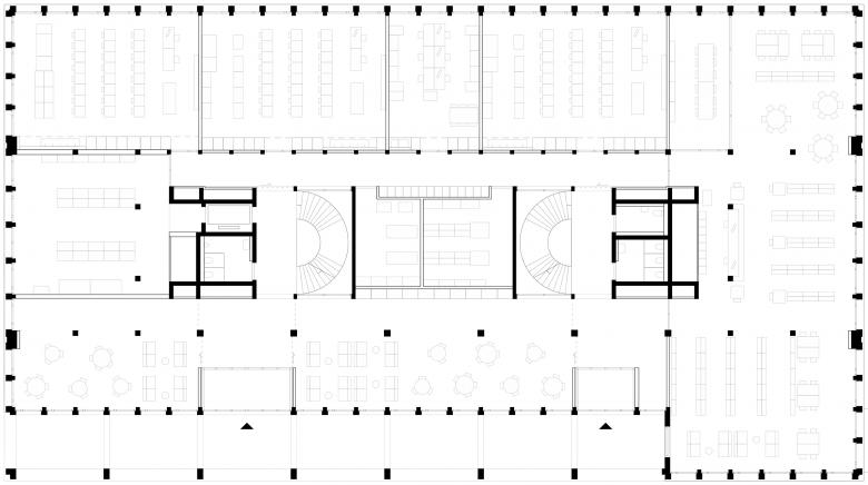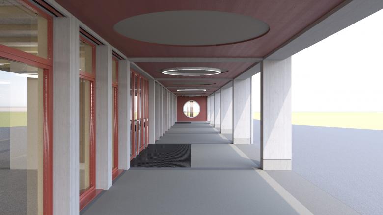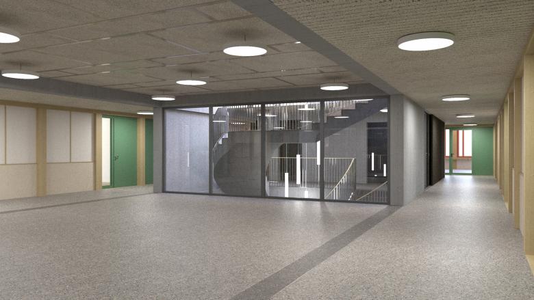 Ein gedeckter Aussenbereich führt zu den Eingängen in das Foyer. Die Mediathek wird zur ruhigen Seite orientiert. Sie erstreckt sich über die gesamte Gebäudetiefe und aktiviert so auch den Eingang mit dem Foyer. In den beiden Obergeschossen befinden sich die Unterrichtsräume, erschlossen durch skulpturale Treppen und einem Rundgang mit Aufenthaltsbereiche entlang der Stirnfassaden.