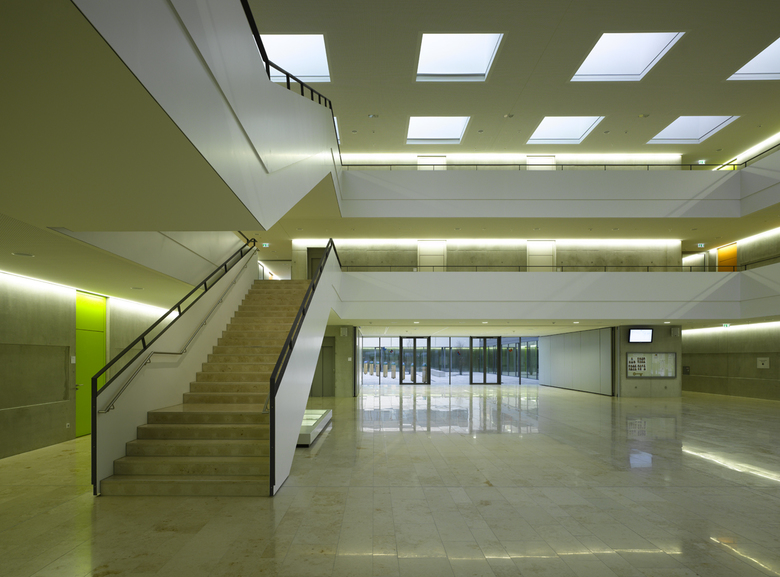 Erschliessung: Über die zentrale Eingangshalle verteilen sich Schüler und Lehrer in die ringförmig angeordneten Räume: Verwaltung und Ganztagesbereich im Erdgeschoss, Klassenräume in den Obergeschossen. Alle Fachklassen befinden sich im Norden. Von jeder Stelle des Gebäudes ist eine eindeutige Orientierung möglich. Querblicke von den Fluren durch die Höfe und Aula schaffen eine kommunikative Situation.