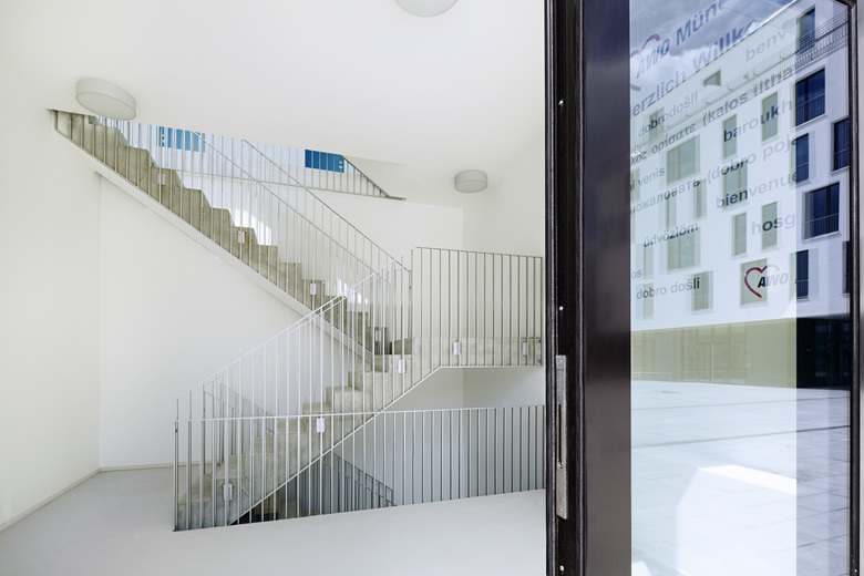 Um das neue Wohngebiet „Haidpark“ im Münchner Norden zur Bahn hin abzuschließen und um dem steigenden Bedarf an Studentischem Wohnen gerecht zu werden wurde 2009 von der Arbeiterwohlfahrt München ein Realisierungswettbewerb ausgeschrieben. BLAUWERK Architekten wurden zusammen mit grabner+huber, Landschaftsarchitekten mit dem 1. Preis in diesem Wettbewerb ausgezeichnet und mit der Planung beauftragt. Das Gebäude schließt den Rand des neu entstandenen Wohnviertels an der nördlichen Stadtgrenze von München. Mit der Form, der Höhe und der Nutzung bildet es in Richtung der U-Bahn-Haltestelle Fröttmaning eine Markierung und einen Eingang zu dem neuen Quartier. Verschiedene Nutzungen wie Studentisches Wohnen, Betreutes Wohnen, Verwaltung, Supermarkt und Gastronomie sind im Erdgeschoss des Gebäudes integriert. Durch seine Form bildet es zwei oeffentliche Plätze aus, die untereinander mit einem Durchgang verbunden sind. Einschnitte, Gemeinschaftsterrassen und Balkone gliedern den Baukörper und stellen einen Bezug zu der umgebenden Bebauung und der Landschaft her. Die Fliederfarbe im Innen- und Außenraum verweist auf die Vegetation in der nördlich angrenzenden Heidelandschaft. Die Farbgestaltung der Innentüren stammt von der Wiener Künstlerin Katherina Mair.