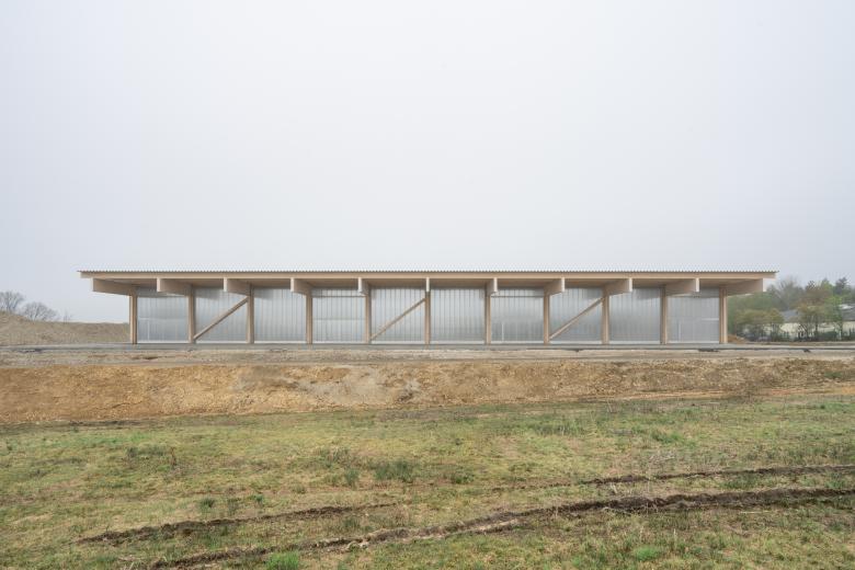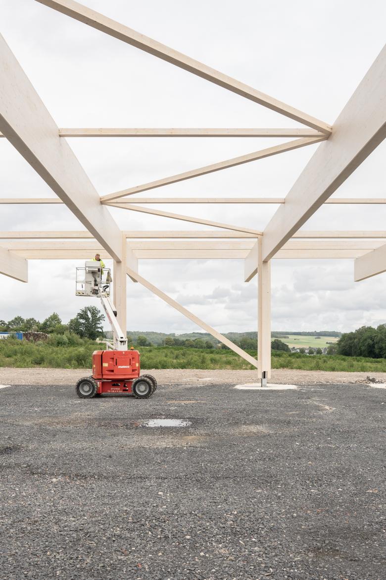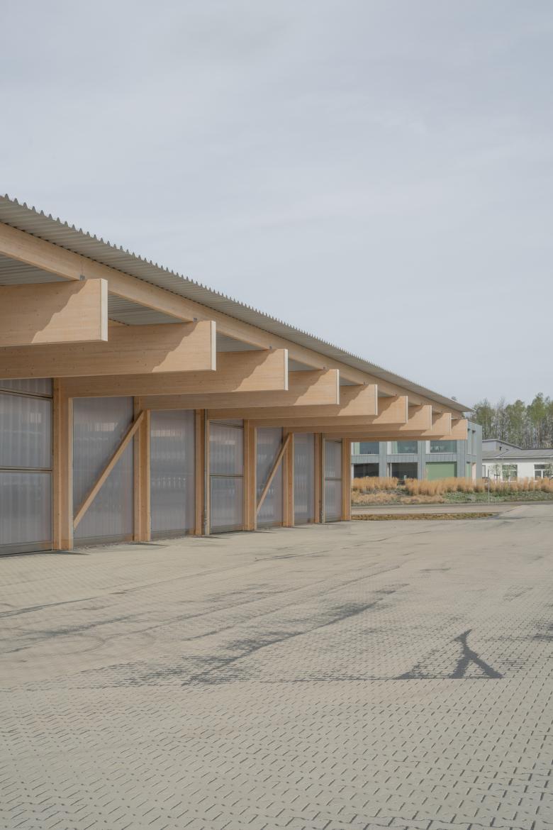 Die Primärkonstruktion besteht aus austarierten Brettschichtholzbindern im Achsraster von sechs Metern. Gelagert werden diese in den Gabeln geteilter und teileingespannter Stützen. Die weit auskragenden Binder entlasten die Feldmitten und generieren eine schlanke Bauteildimensionierung.