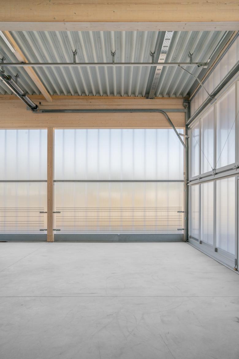 Umhüllt wird die Lager- und Produktionshalle von einer transluzenten Polycarbonat-Fassade mit zweifach geteilten Sektionaltoren.