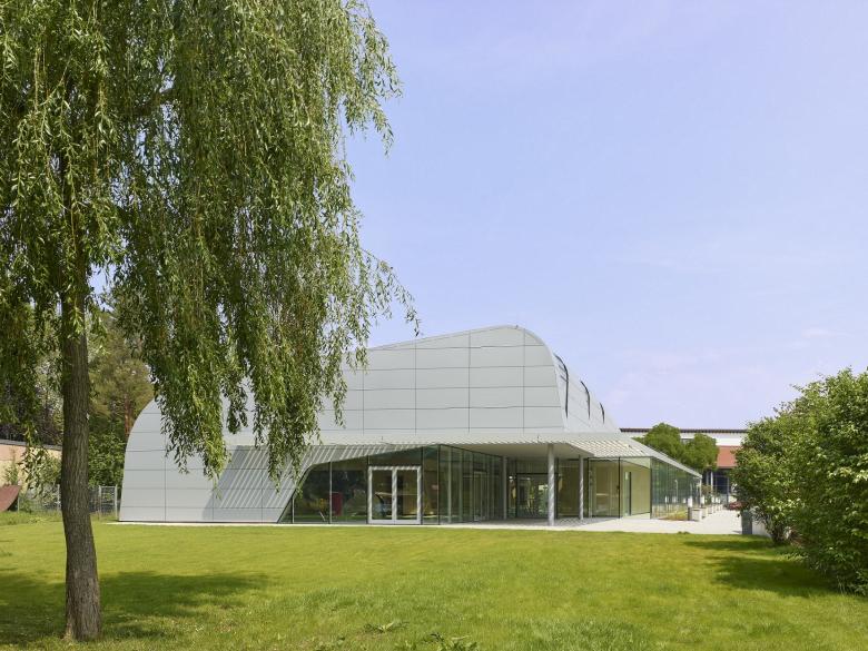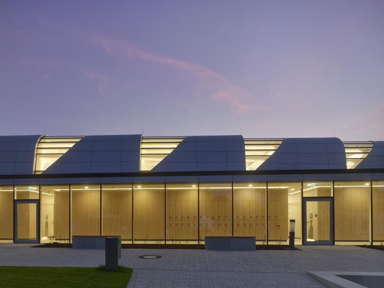 Ein Nord-Süd verlaufender Grünzug prägt das Grundstück und das Umfeld mit bestehendem Freibad und Veranstaltungshaus. Am Nordwest-Eck platziert und in Nord-Süd-Richtung ausgerichtet, bindet sich der Neubau schlank in die bestehende Situation ein. Die bestehenden Gebäude mit Garagen, DRK/DLRG und Kiosk bleiben erhalten und sind Bestandteil des neuen Ensembles.