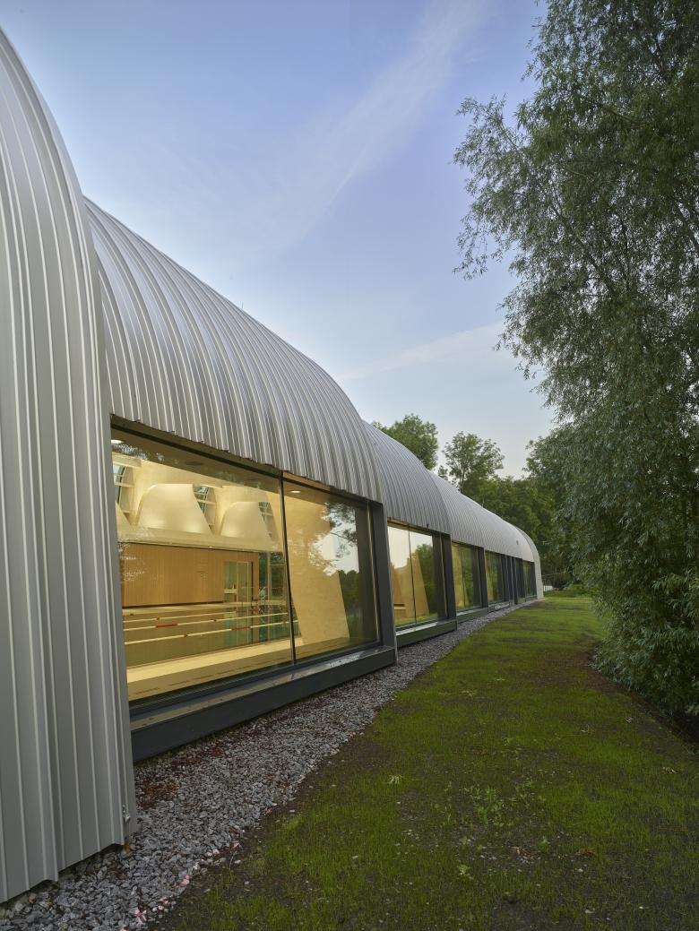 Das Kellergeschoss als auch die Becken, die mit einer aufgeständerten Edelstahlauskleidung versehen sind, bestehen aus einer Stahlbetonkonstruktion. Das Dachtragwerk des Neubaus sind gebogene Leimbinder aus Holz. Die opaken Fassadenflächen in Dach und Wand sind mit eloxiertem Aluminiumblech verkleidet. Die transparenten Bauteile sind Stahlpfostenriegelfassaden mit 2- oder 3-fach-Verglasung.