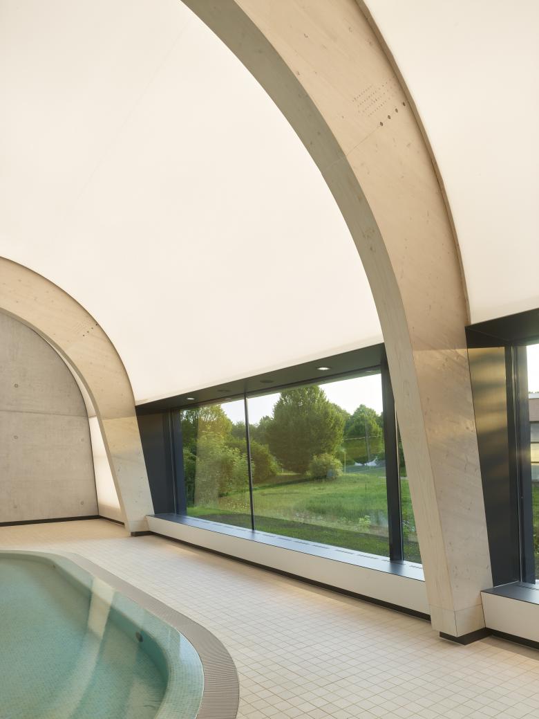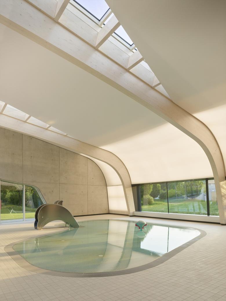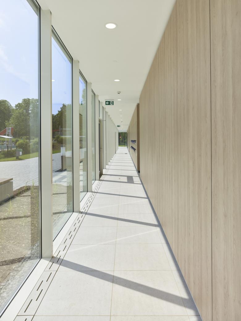 Der Haupteingang zum Hallenbad orientiert sich nach Osten, bildet Platzkante und Adresse und schafft kurze Wege zu den vorgelagerten Parkplätzen. Haupteingang und Foyer beherbergen eine Kasse, bzw. Automaten für den Winterbetrieb. Die Umkleideeinheit bedient sowohl das Hallenbad als auch das Freibad. Das Foyer mit Büro- und Infrastruktur lenkt den Weg zu den Umkleideeinheiten und ermöglicht einen guten Blick in die Badehalle. Das 25-m-Becken mit großzügigen Umgangsflächen ist nach Westen zum Grünzug, und das Kinderbecken am Südende nach Süden, mit Nähe zum Kinderbecken des Freibads, orientiert.