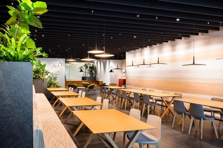 レセプションの壁一面は木ルーバーで包み込み、エッジのない一体的な空間を成立させています。有機的な空間に対し、直線的な家具をランドスケープとして配することでバランスを取りながら、利用者が思い思いの居場所を見つけられるレイアウトを実現。