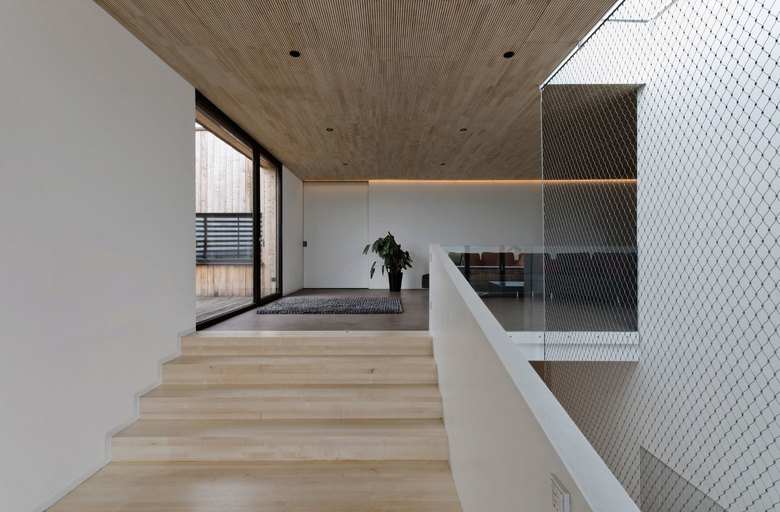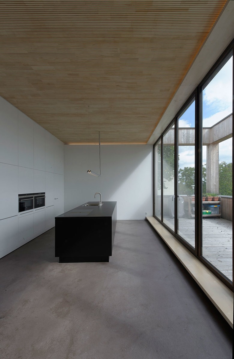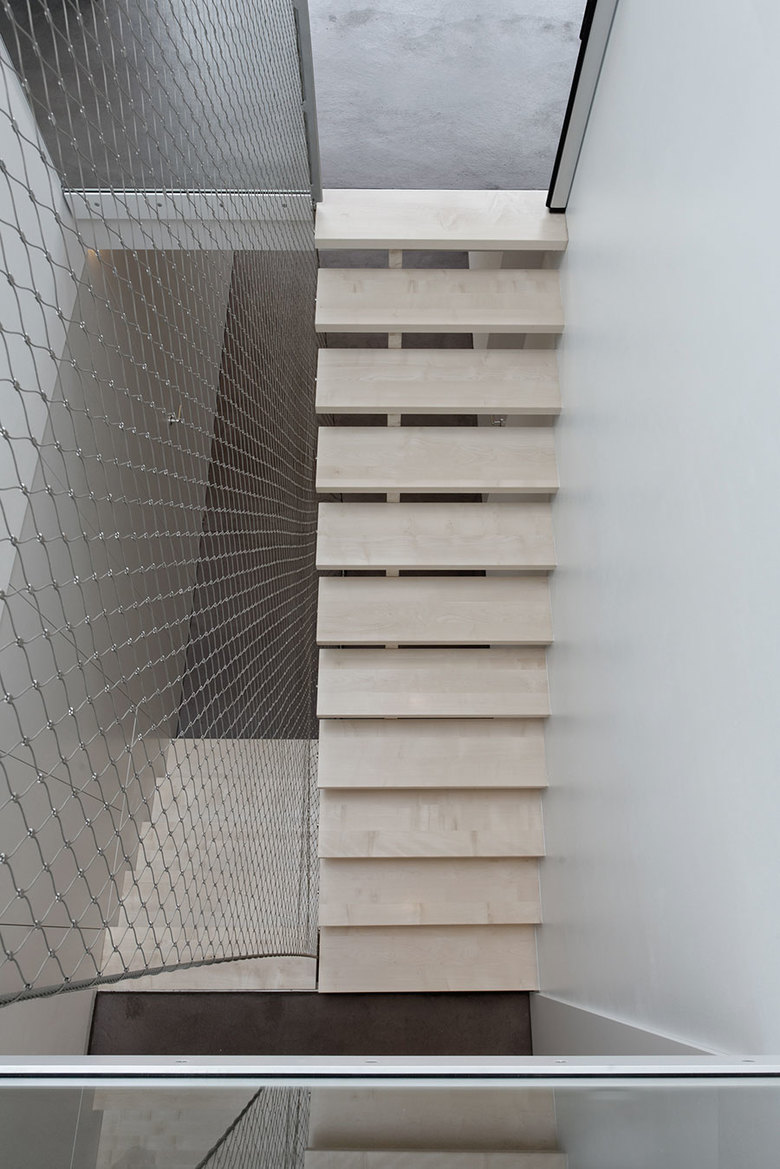 Auf der untersten Ebene befinden sich die Büro- bzw. Kinderzimmer mit den Sanitäreinrichtungen und direktem Zugang zum Garten. Die Zwischenebene nimmt den Wohn-Essbereich mit der nach Süden orientierten Terrasse auf. Die oberste Ebene ist dem Wohnen vorbehalten, an das sich der Rückzugsbereich der Bauherren anschließt.