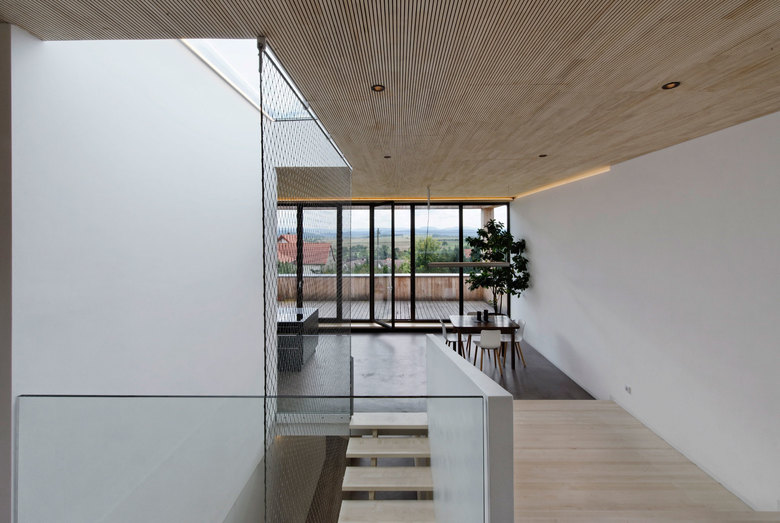 Die Lage des Baugrundstückes am Hang, gleich neben einer kleinen Kapelle am Ende des Dorfes Haigerloch-Trillfingen, ermöglicht nach Süden den Blick auf die Schwäbische Alb. Um diese Besonderheit zu nutzen und im ganzen Haus erlebbar zu machen, wurde für das Haus in Holzbauweise ein Splittlevel gewählt.