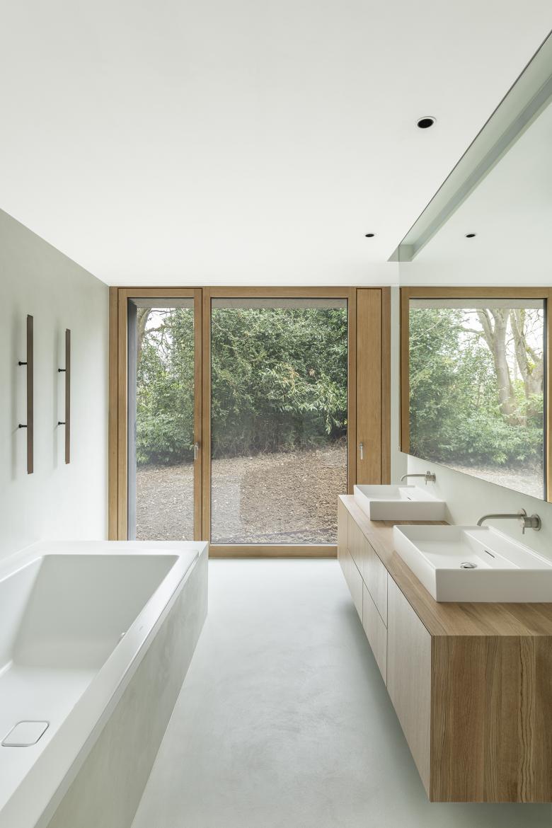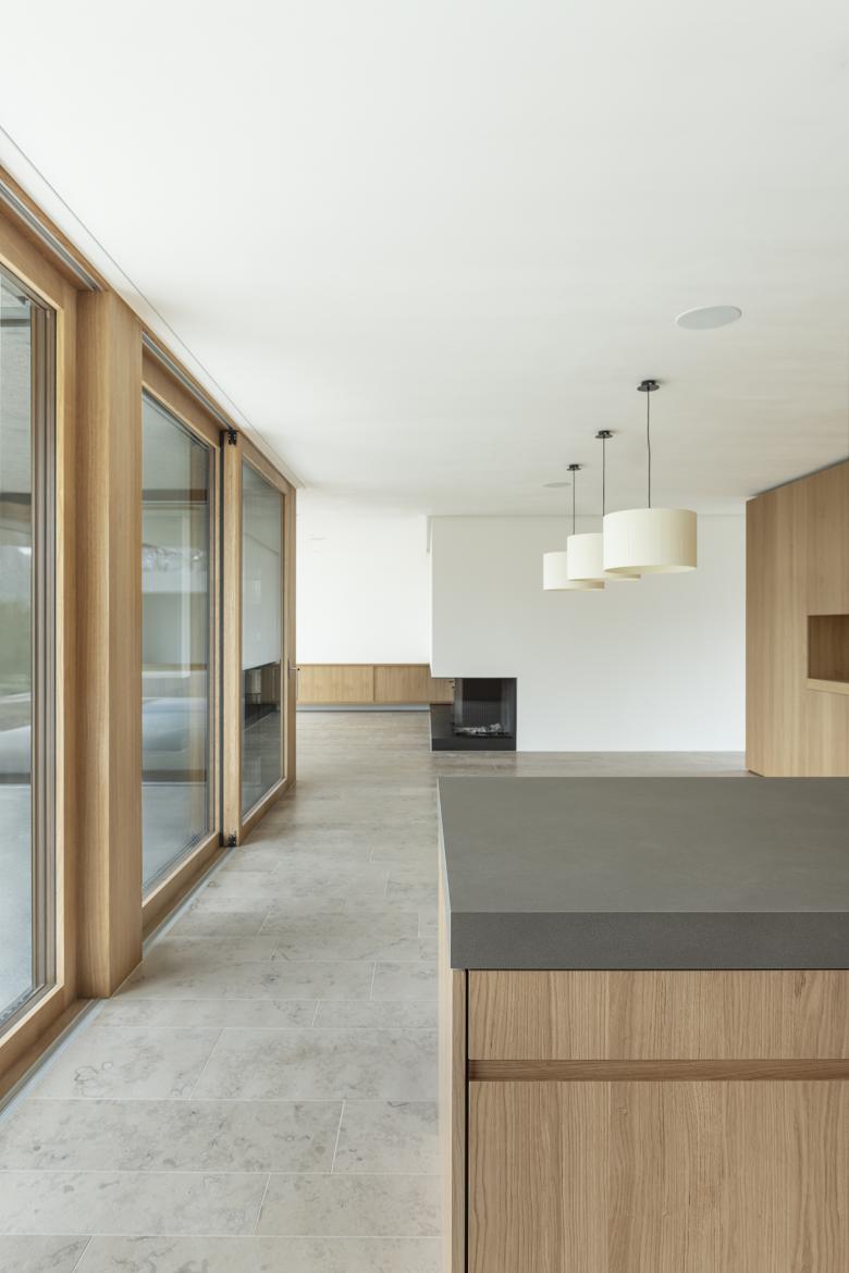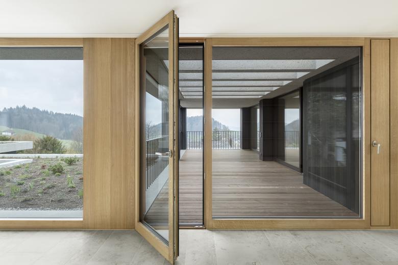 Grossflächige Schiebefronten öffnen den grosszügigen Wohn- und Essbereich im Erdgeschoss hin zur Landschaft, schaffen einen fliessenden Übergang von Innen nach Aussen und bilden einen lichten Gegensatz zur schwarzen Holzfassade. Analog dazu stehen die gestaltgebenden, raumhohen Eiche-Einbauten in sämtlichen Innenräumen beider Gebäudeteile. Ergänzt mit Natursteinböden ergibt sich eine angenehme Atmosphäre aus reduzierter Gestaltung und wertiger Ausführung.