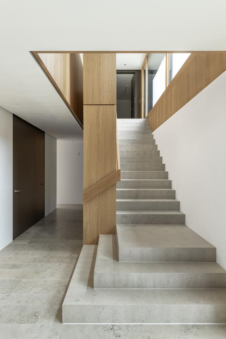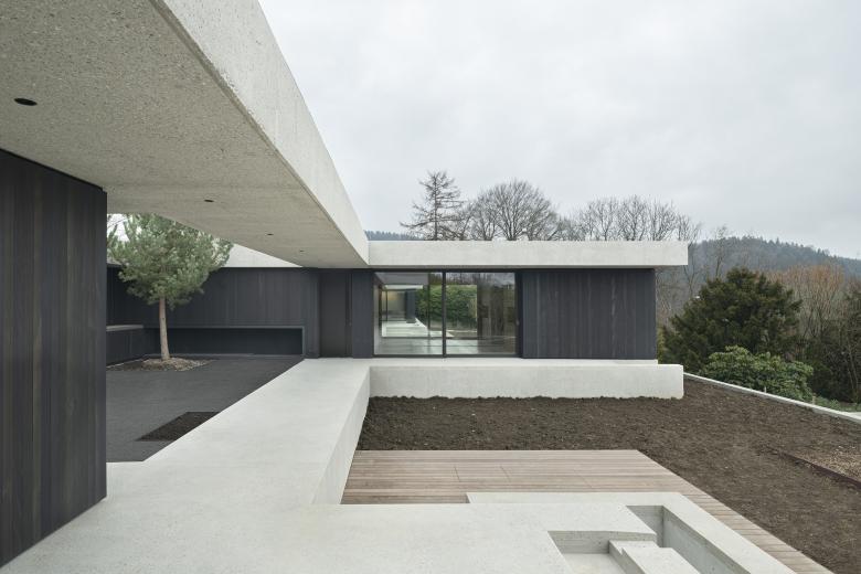 Die reduzierte Architektursprache des Hauses orientiert sich an der umliegenden und unter Schutz stehenden Teppichsiedlung «Kammelenberg» aus den 60er Jahren. Dabei umspannen Sockel, Geschossdecke und Dach in Sichtbeton die geflammten Holzfassaden, die durch die japanische Shou Sugi Ban-Technik durch kontrolliertes Anbrennen haltbar gemach werden. Die dabei einsetzende Karbonisierung konserviert das Holz auf natürliche Weise, es wird nicht nur witterungs- und insektenbeständig sondern erhält so auch seine prägnant-schwarze Einfärbung.