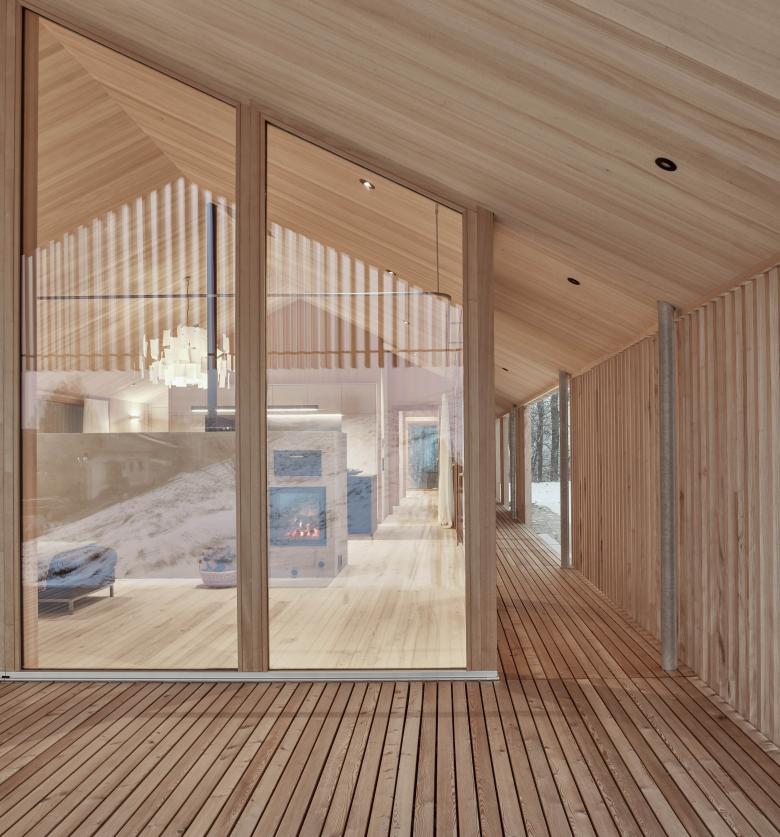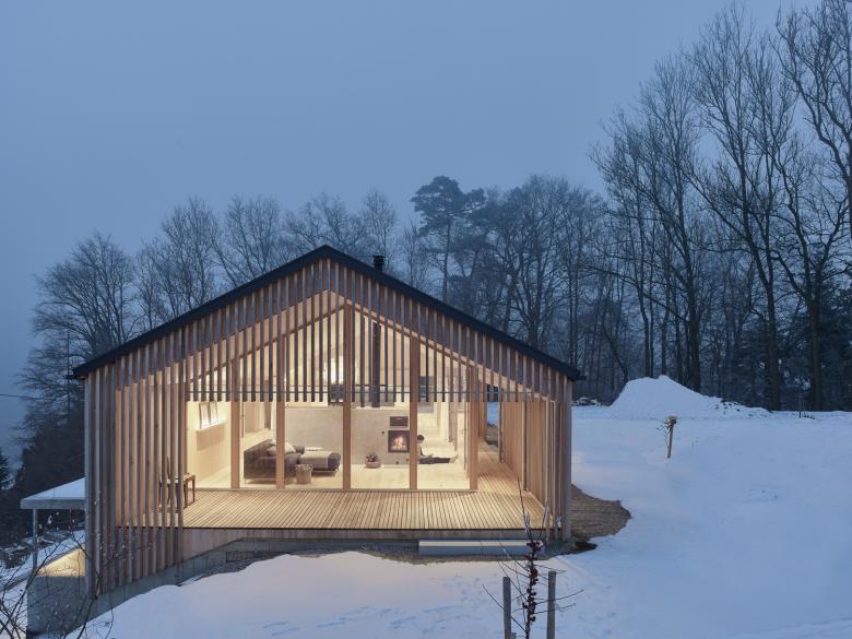 Der Entwurf greift die Typologie des Langhauses auf, die Raumeinheiten fließend aneinandergereiht. Umlaufende Wege verbinden diese innerhalb des frei spürbaren Gebäudevolumens. Das Miteinander im Alltagsleben findet auf der oberen Ebene statt, im Hanggeschoß findet eine kleine Einliegerwohnung für alternative Nutzungsmöglichkeiten Platz. Holzoberflächen prägen die warme Atmosphäre des Hauses, der gemauerte Speicherofen als präsentes Gestaltungselement sorgt des Öfteren für den Duft nach frisch gebackenem Brot.