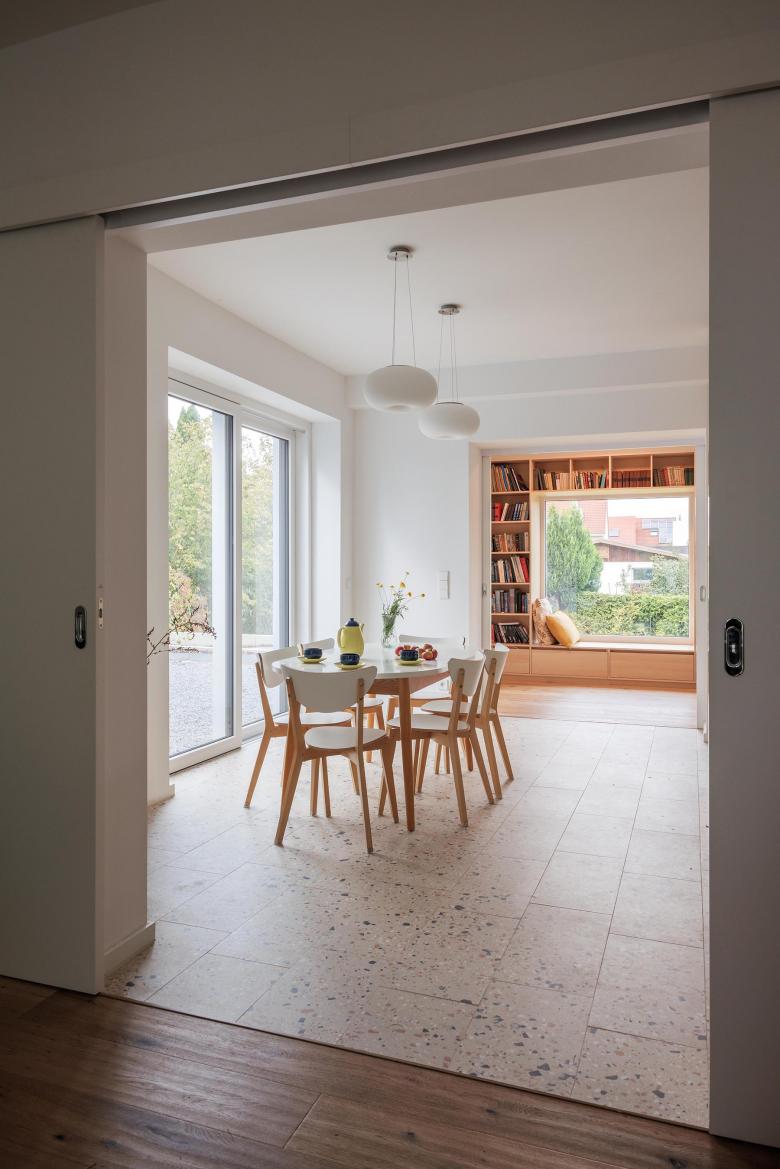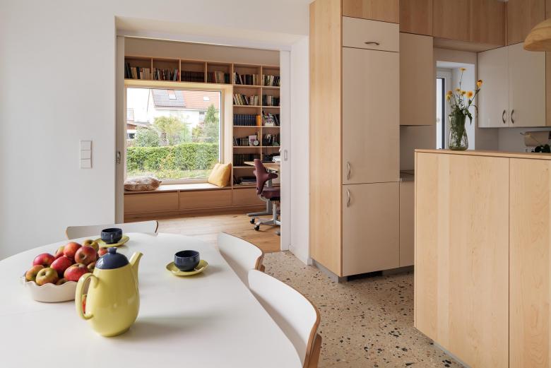 Wir haben die Raumaufteilung im Erdgeschoss durch zwei große Wanddurchbrüche und den Abriss der alten Küchenwand verändert. Der zentrale Raum wurde zur Wohnküche, die durch großzügige Schiebetüren mit dem Wohnzimmer und dem Arbeitszimmer verbunden ist. So entsteht aus kleinteiligen Räumen eine durchgehende, großzügige Raumfolge zwischen Vorgarten und rückwärtigem Garten. Durch neue Schiebetüren wird die Wohnküche schwellenlos mit der Außenterrasse verbunden.