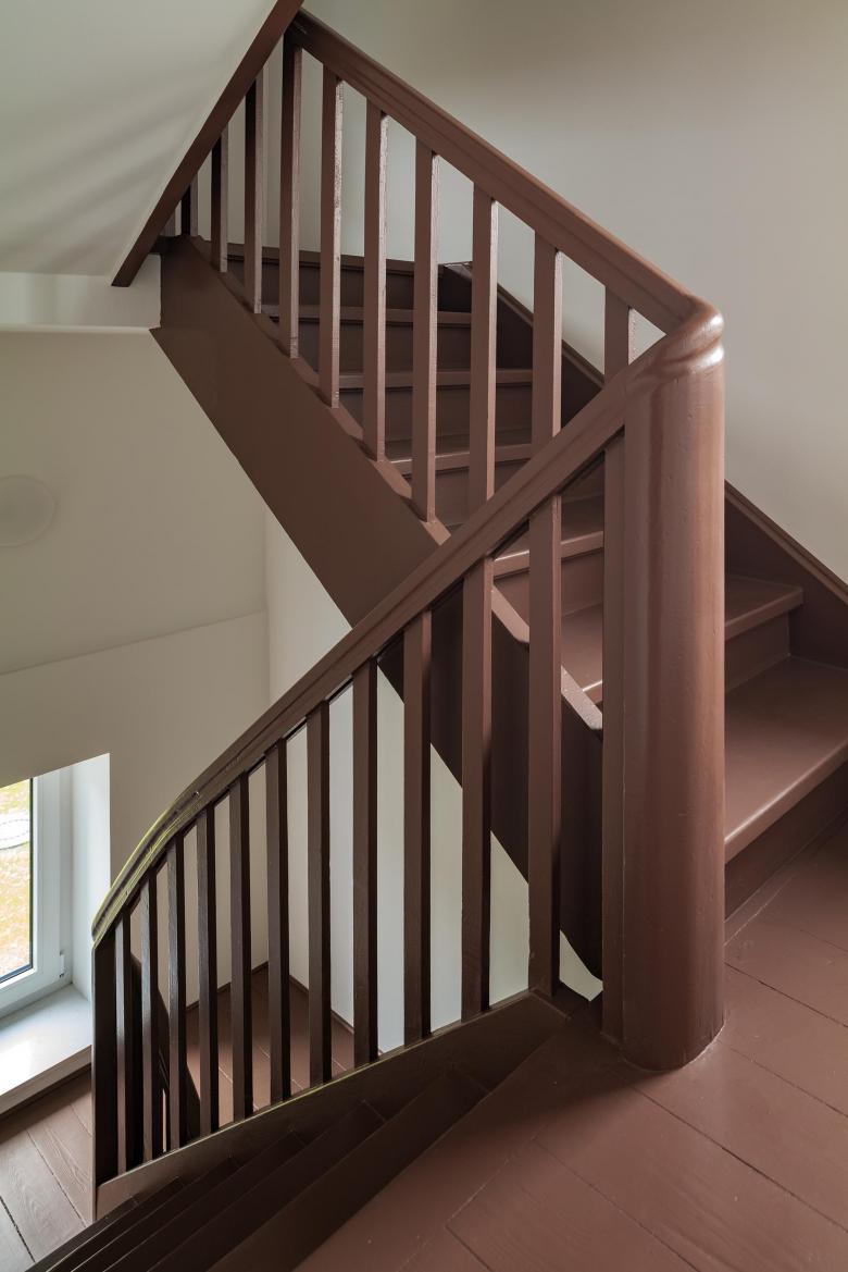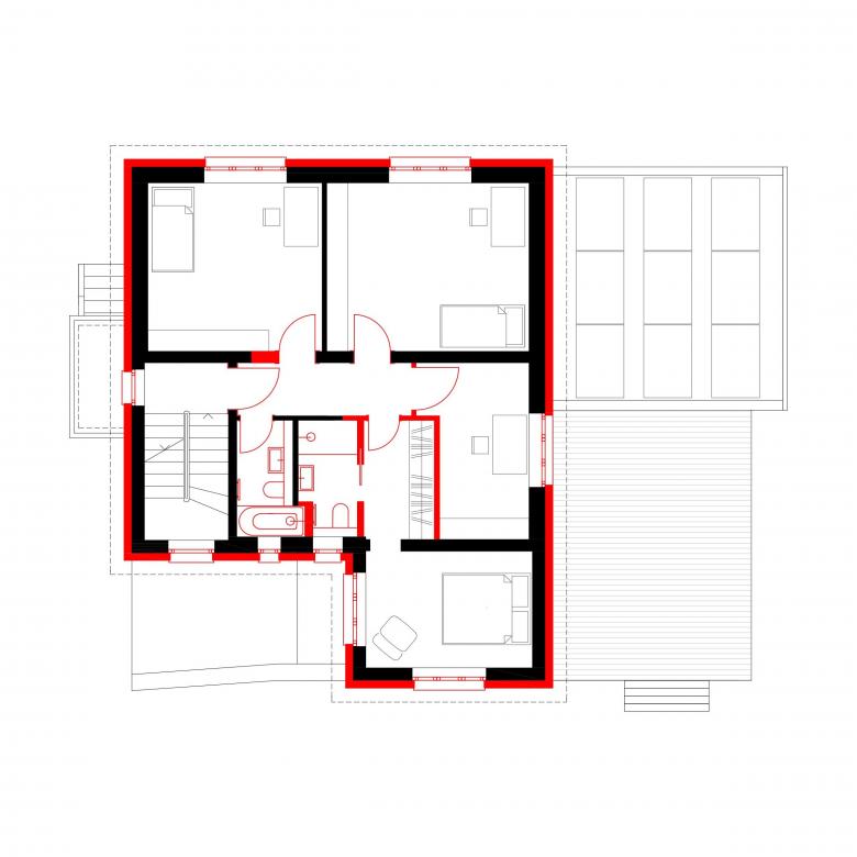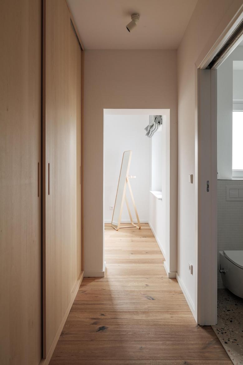 Das Obergeschoss blieb in seiner kleinteiligen Struktur weitestgehend erhalten. Dort befinden sich drei Schlafzimmer sowie ein weiteres Arbeits- und Gästezimmer. Eine Leichtbauwand wurde versetzt, sodass ein zusätzliches kompaktes Bad mitsamt Garderobe am Elternschlafzimmer entstanden ist.