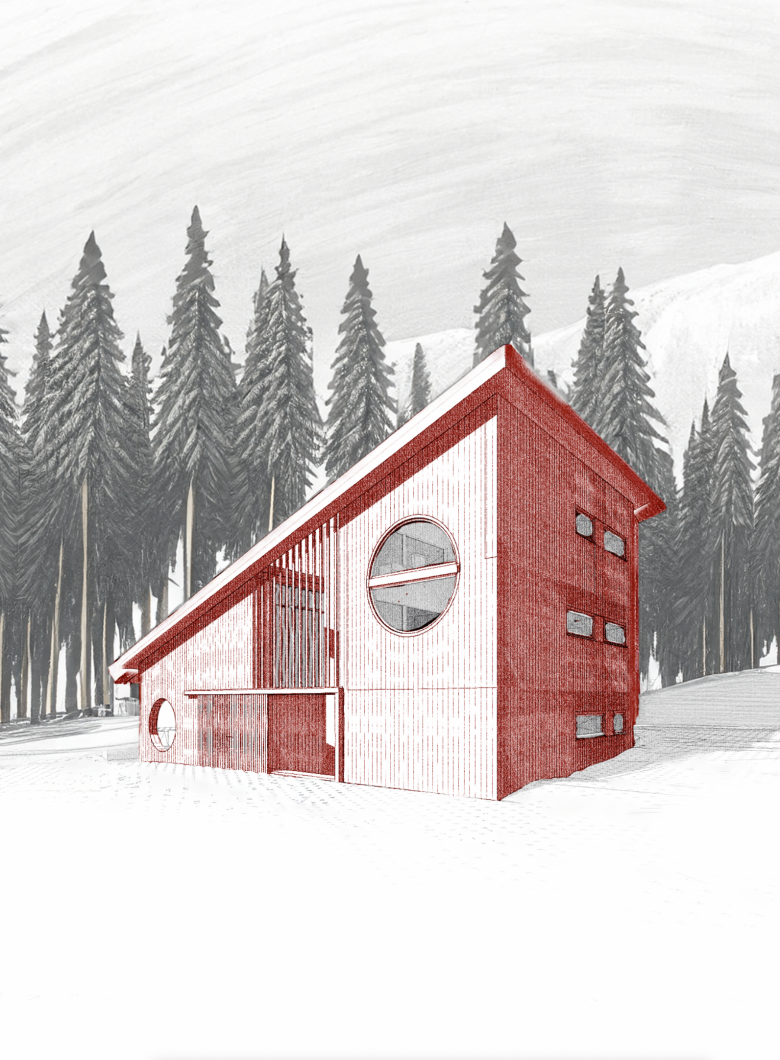 Die rote Holzfassade ist kein Statement, sondern ein Werkzeug: maximaler Kontrast zum Wald, klare Lesbarkeit des Baukörpers. Farbe statt Tarnung. Ordnung statt Dekor.