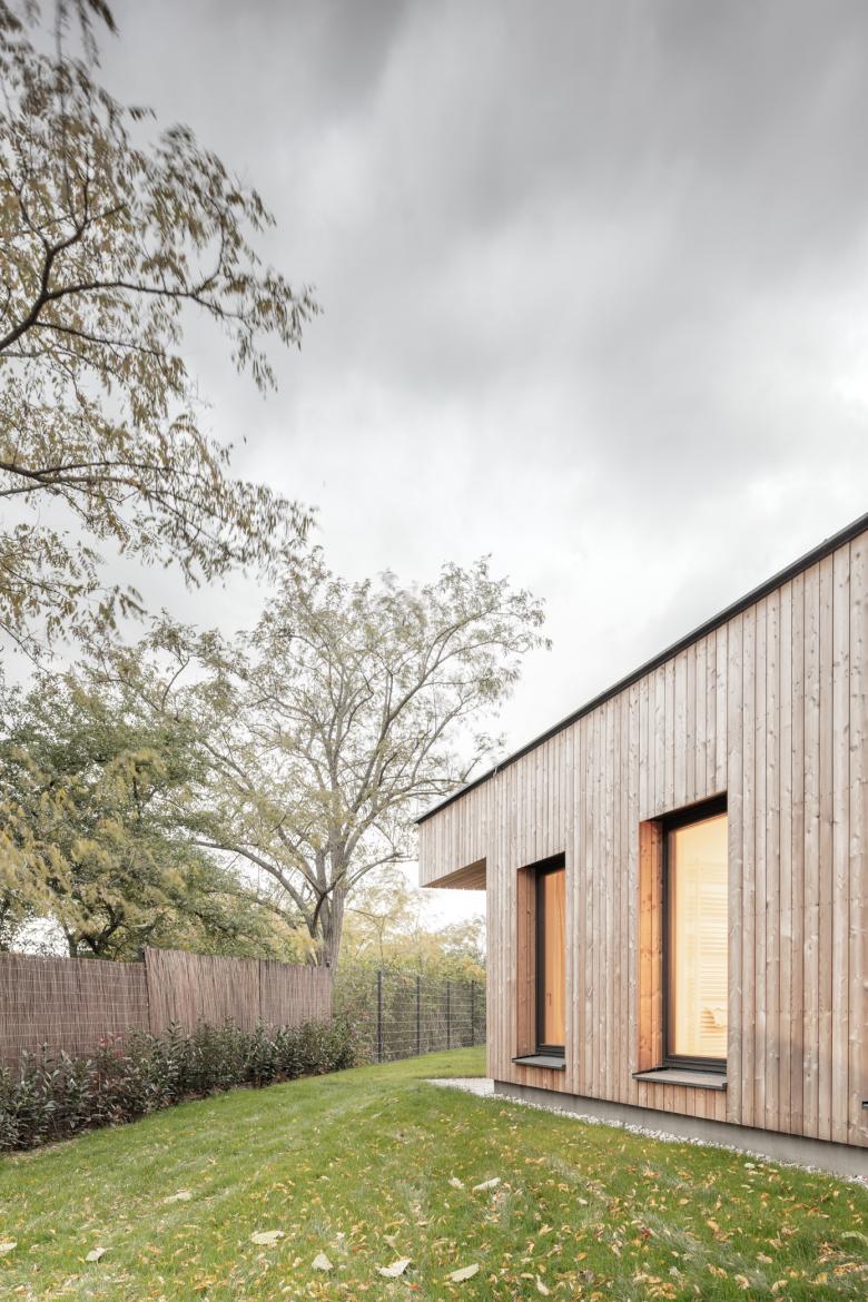 Der Neubau wurde so positioniert, dass anstelle der vorherigen drei Restflächen eine große zusammenhängende Gartenfläche entstand. Diese orientiert sich in Richtung der daneben fließenden Schwechat und somit sind von der Terrasse und vom Garten so gut wie keine Nachbargebäude zu sehen. In diese Richtung öffnet sich das Haus; zu dem direkten Nachbarn auf der gegenüberliegenden Seite bleibt es relativ geschlossen.