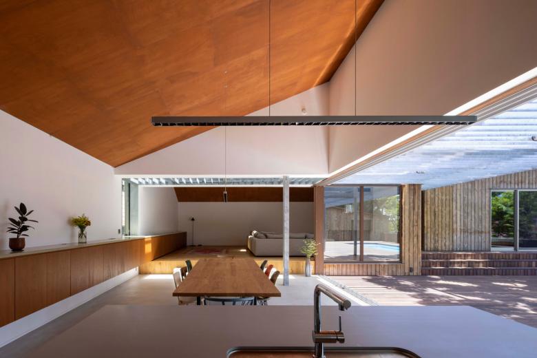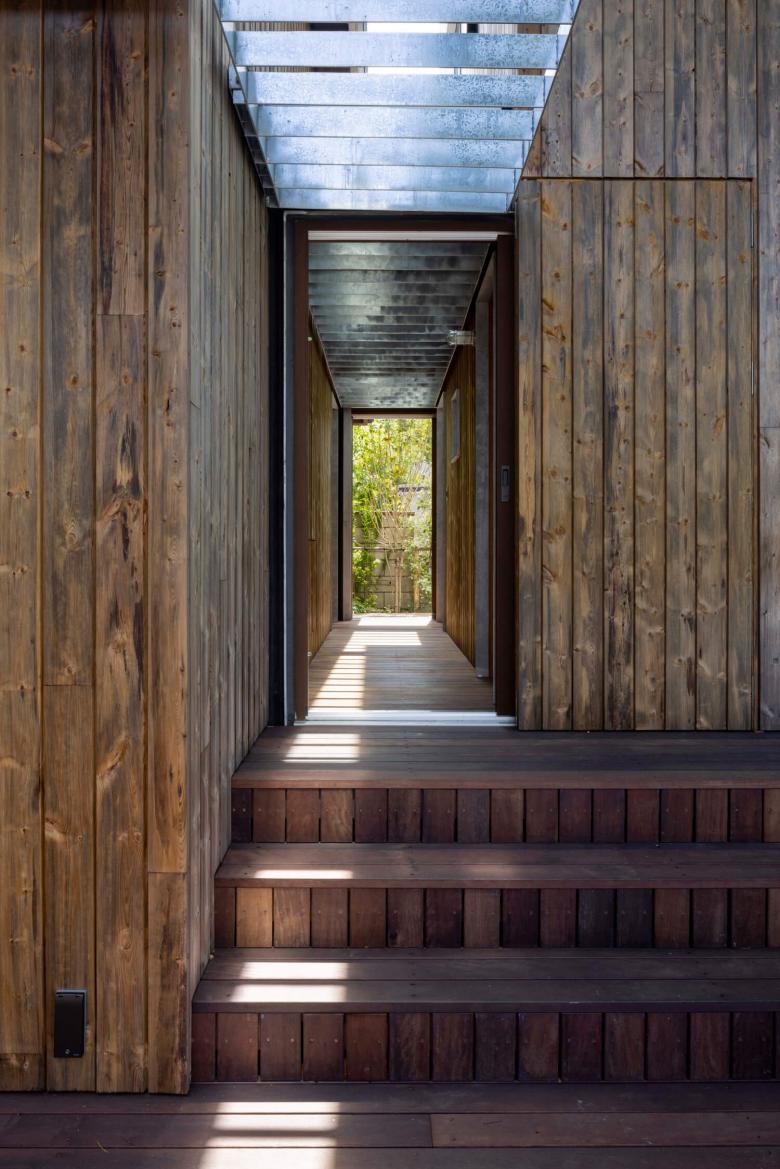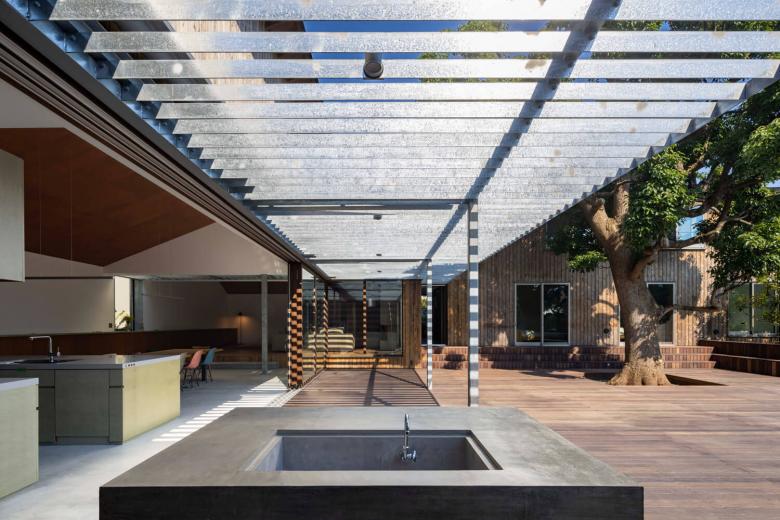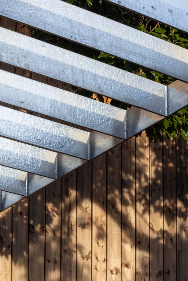 それぞれの棟の隙間は、プールサイドの中庭から周縁部に抜ける動線で、海陸風と光の通り道にもなっている。分散した建物を緩やかに繋ぐ役目を果たしているのは、溶融亜鉛メッキで仕上げたルーバーのパーゴラで、ダイニング棟の南側のデッキを覆って環境調整するだけでなく、トップライトの日除けとして各建物の隙間に入り込んでいる。