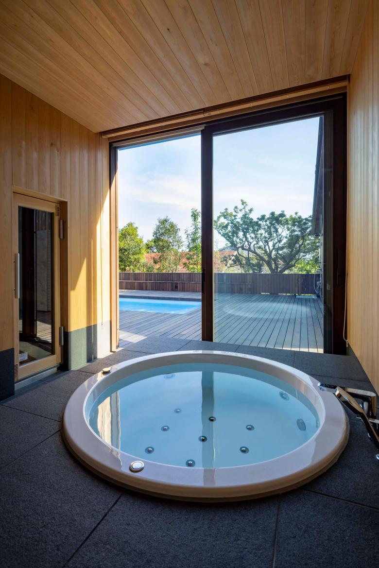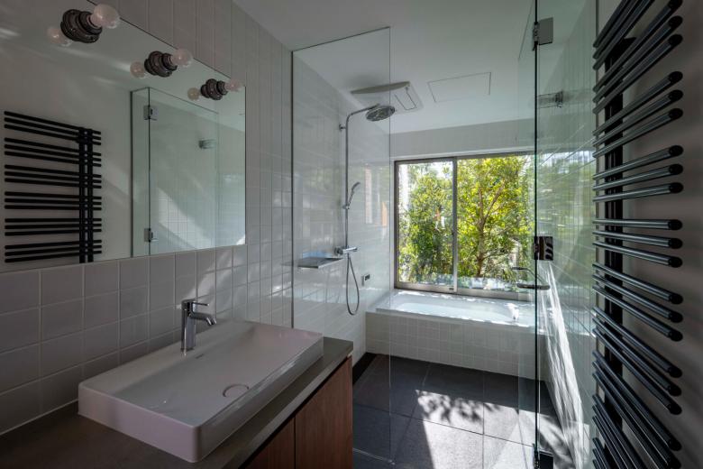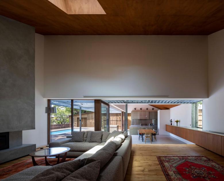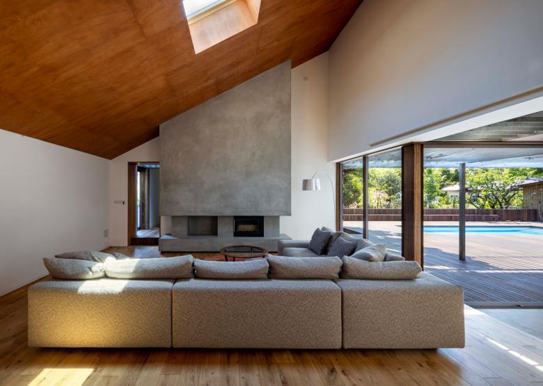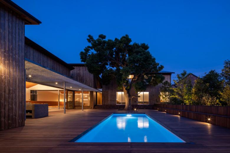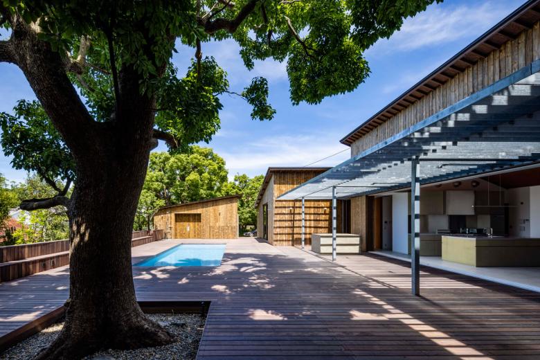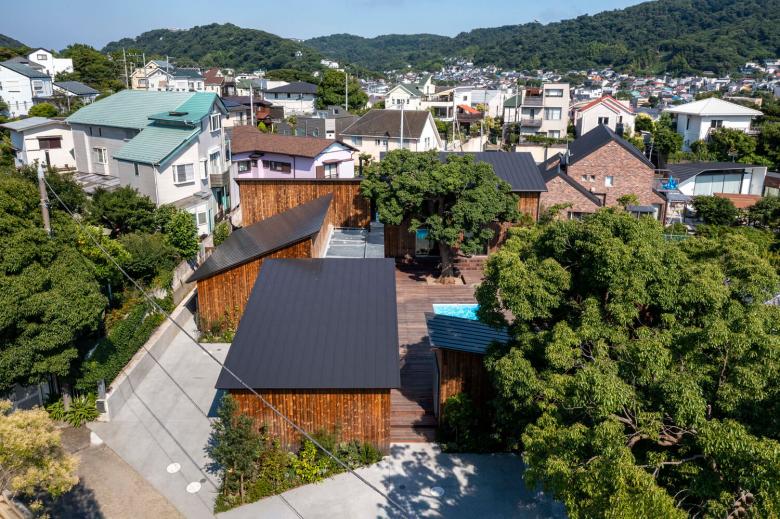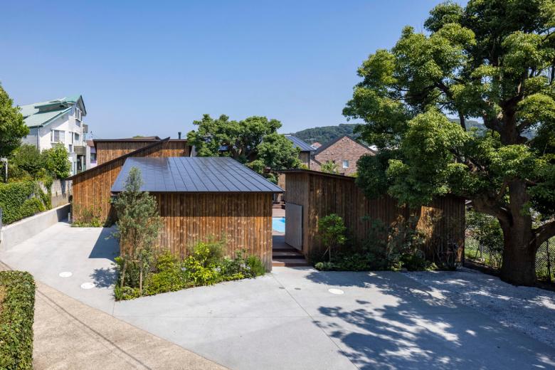 この別荘ではプールが計画されたため、北側や東側に対して建物ヴォリュームを建てて、プライバシーを確保するように検討した。隣接する住宅に威圧感を与えないように分棟とし、ダイニング棟、リビング棟、宿泊棟、駐車場と浴室のあるサービス棟、倉庫棟の5つの棟がプールのある中庭を取り囲み南の海側に開いた構成とした。各棟の高さは基本的には内部の機能に合わせているが、それぞれの屋根の勾配を調整して、周辺建物との関係を構築した。北西の住宅の庭への採光を配慮し、ダイニング棟は敷地境界に向けて建物高さを抑えた片流れの屋根を設け、敷地境界に迫っている北東の3階建ての住宅に対しては、プールのプライバシーと隣地から海への眺望を両立する急勾配の屋根を設けた。東側の別荘は海への眺望を直接持っているので、お互いのプライバシーを確保するために宿泊棟は2階建とし、心地よい木陰をプールサイドに落としてくれる、日露戦争の戦勝祝いに植えられたというクスノキが生育しやすいように、中庭側に下がる片流れの屋根とした。